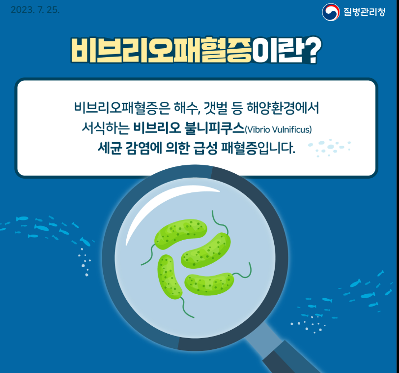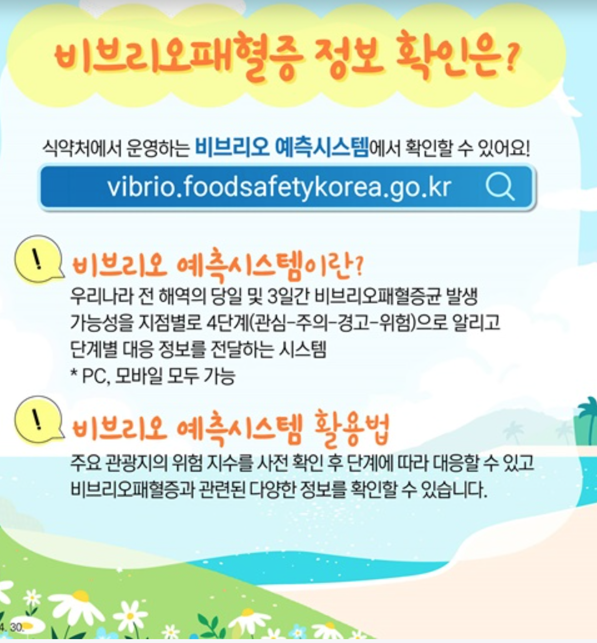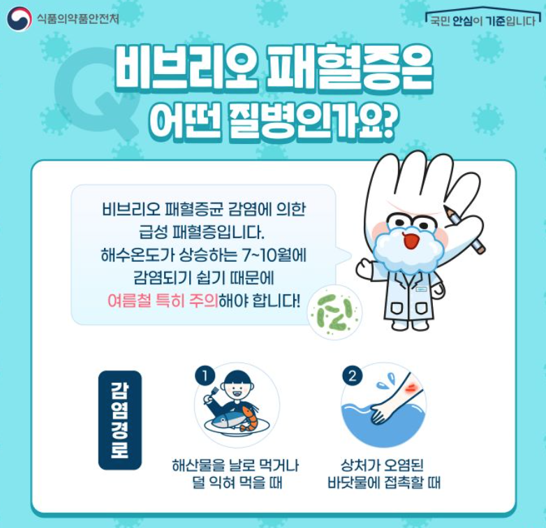 특히 만성질환자나 노약자, 면역 저하자분들은 여름철 어패류 섭취와 해수욕에 각별히 주의가 필요합니다.