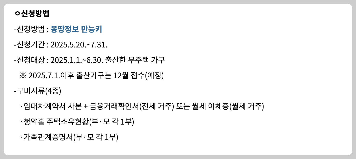 👉 서울 무주택 출산가구 주거지원 신청 페이지 바로가기 https://umppa.seoul.go.kr/hmpg/sprt/cnls/bzin/bzmgPageDetail.do?biz_mng_no=197DA8F773AAE8DCE063A6022162FF67