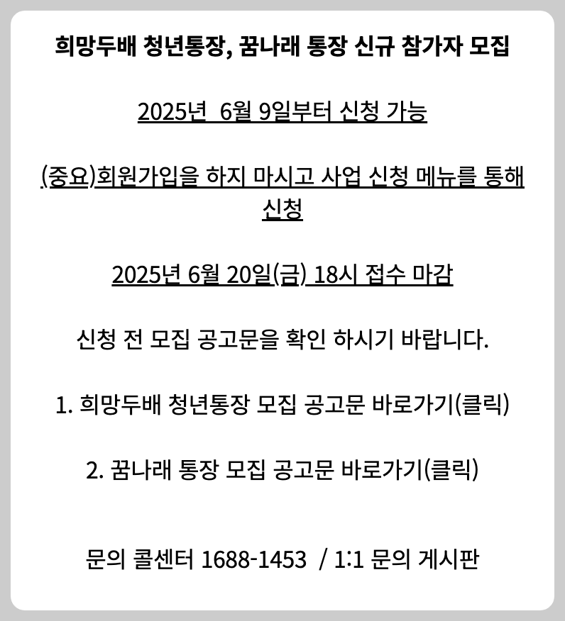 2025년 청년통장 신청 기간은 6월 9일(월)부터 6월 20일(금)까지입니다.