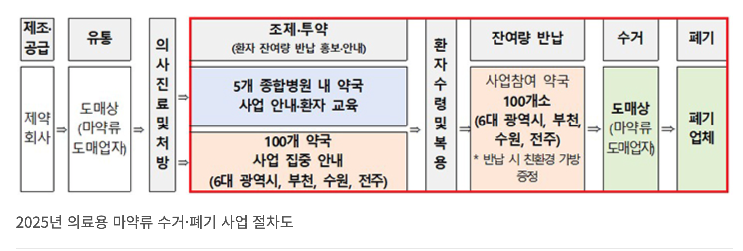 2025년 5월 27일, 식약처는 가정 내 마약류 의약품의 오·남용과 불법 유통을 막기 위해 대한약사회, 한국병원약사회와 함께 이 사업을 실시한다고 발표했습니다.