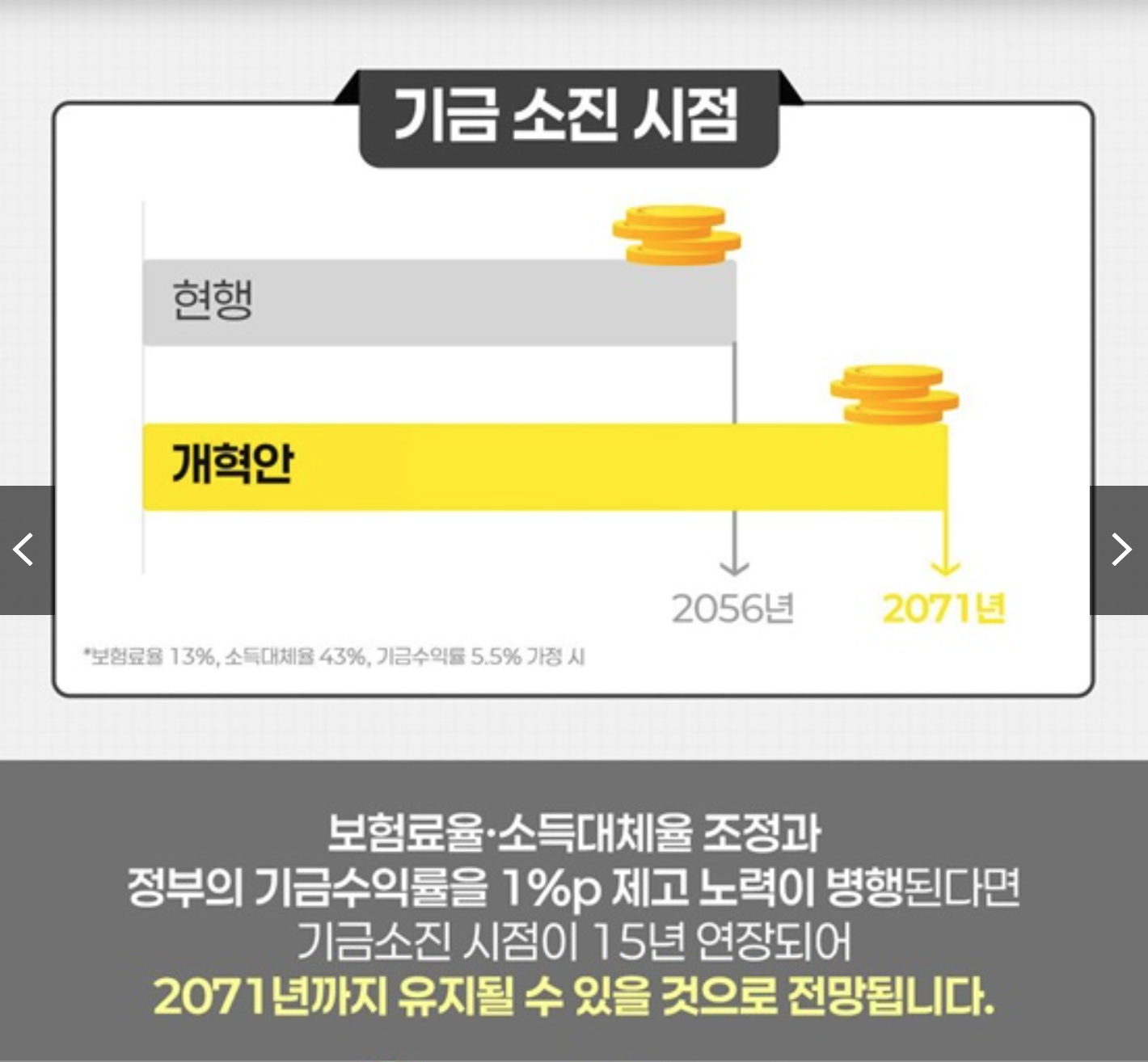 현재 국민연금의 재정은 2055년경 기금 고갈이 예상되고 있습니다. 이에 따라 재정을 안정적으로 운영하기 위해 보험료율을 점진적으로 인상하는 조치를 도입한 것입니다.