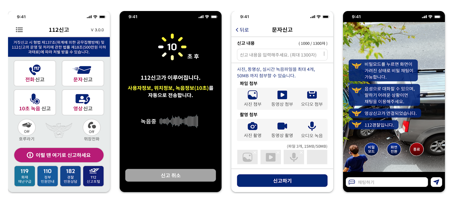 말하기 어려운 상황에서 빠르게 신고할 수 있고, 문자·영상 신고, 위치 전송도 가능합니다.