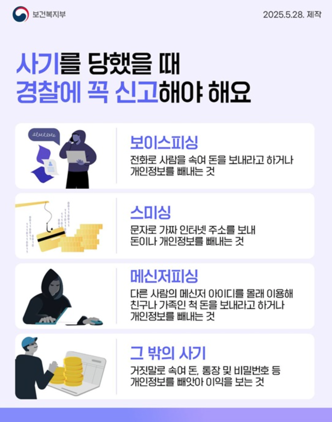 - 사기: 보이스피싱, 스미싱, 메신저피싱 등 속여서 돈이나 개인정보를 빼앗는 행위