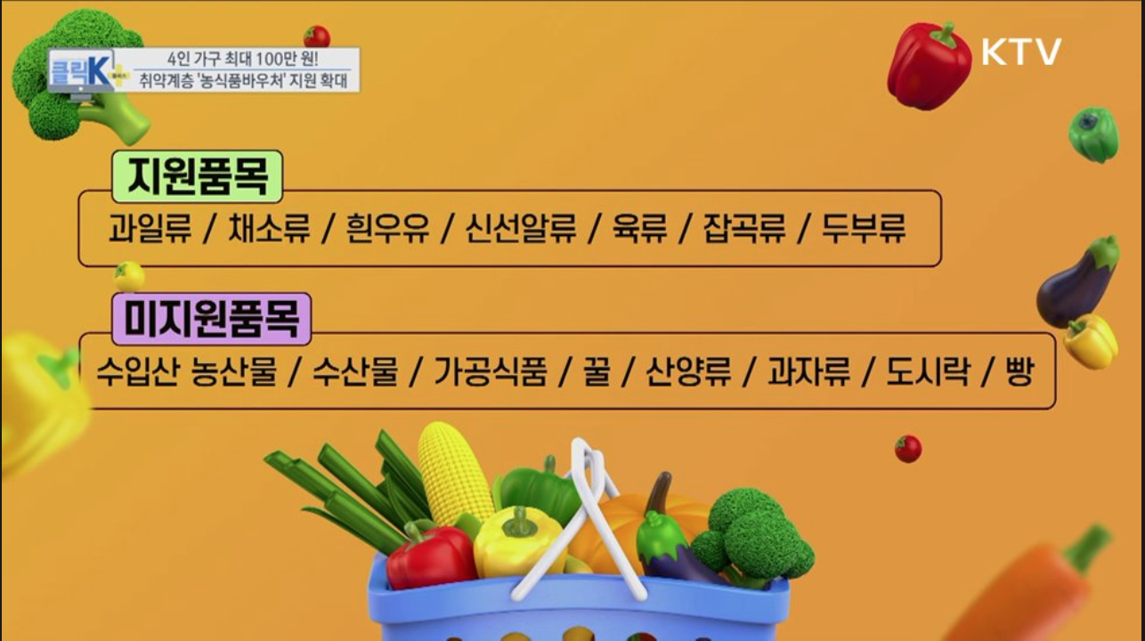 단, 바우처는 오직 국산 농산물 및 신선식품(채소, 과일, 흰 우유, 육류, 두부, 달걀 등)에만 사용 가능하며, 라면·과자·음료·가공식품·수입산 제품은 구매 불가하니 꼭 주의하세요.