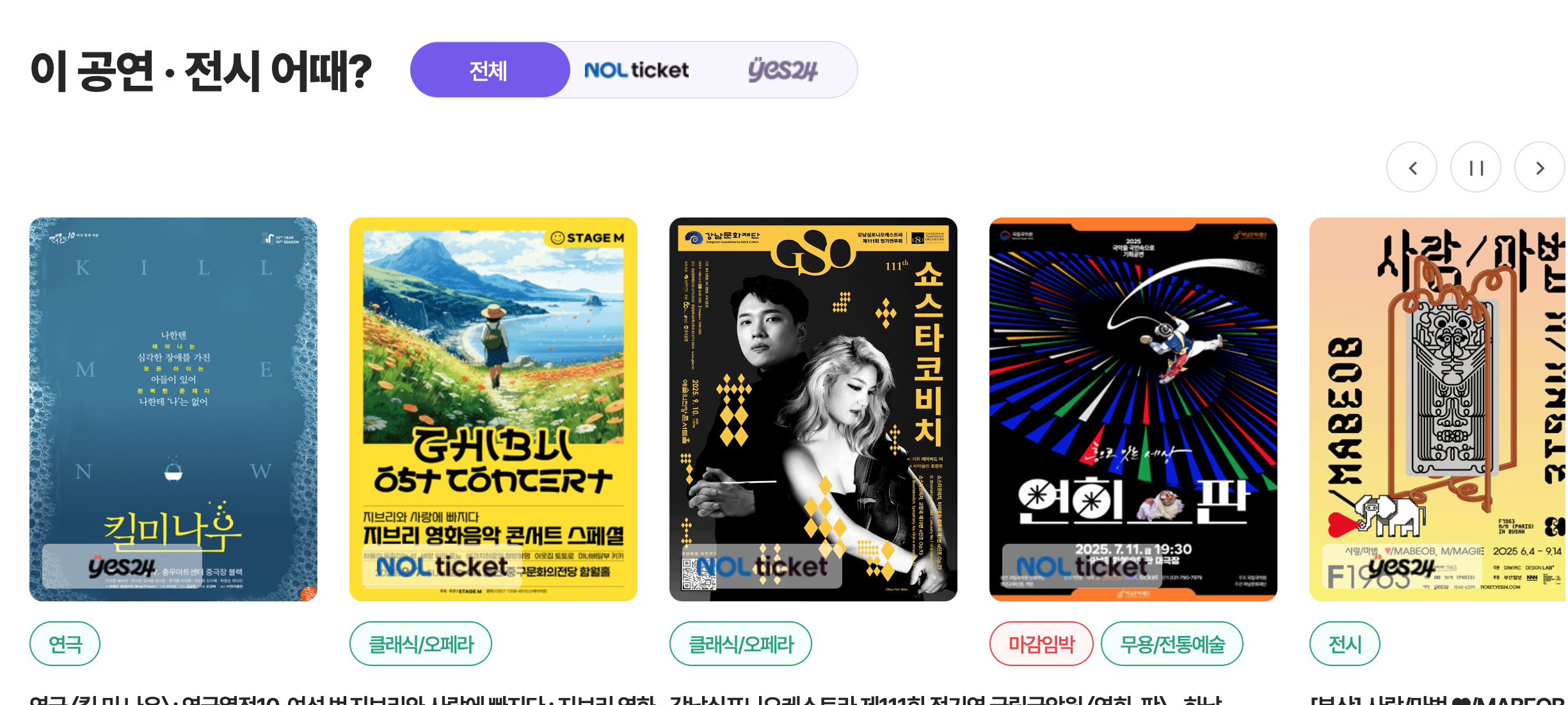 아래는 현재 할인 적용되는 대표 공연입니다. 예매는 인터파크/YES24에서 진행됩니다.