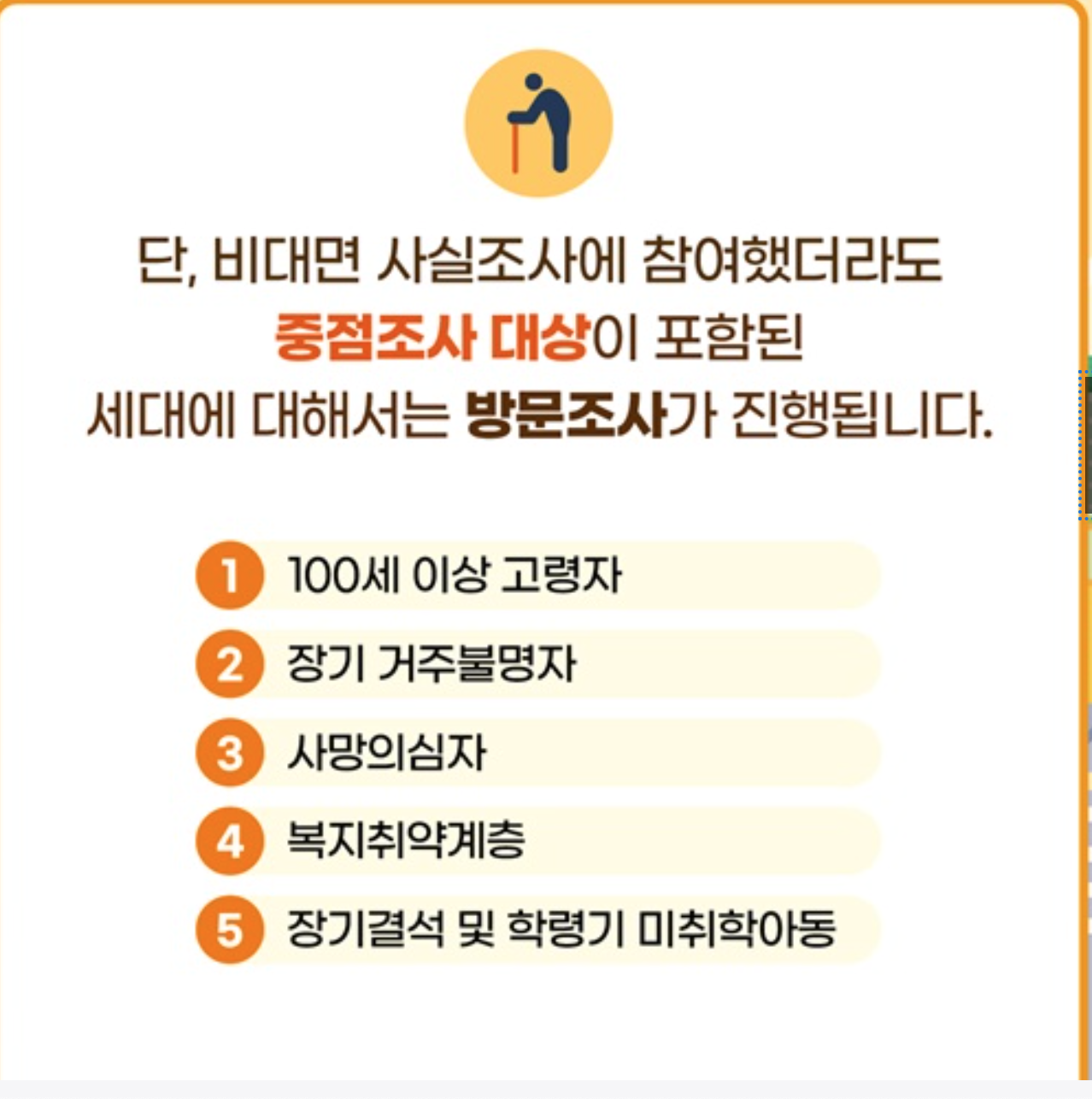 비대면 조사에 참여하지 않은 세대는 9월 1일부터 10월 23일까지 순차적으로 이·통장 또는 공무원의 직접 방문조사를 받게 됩니다.