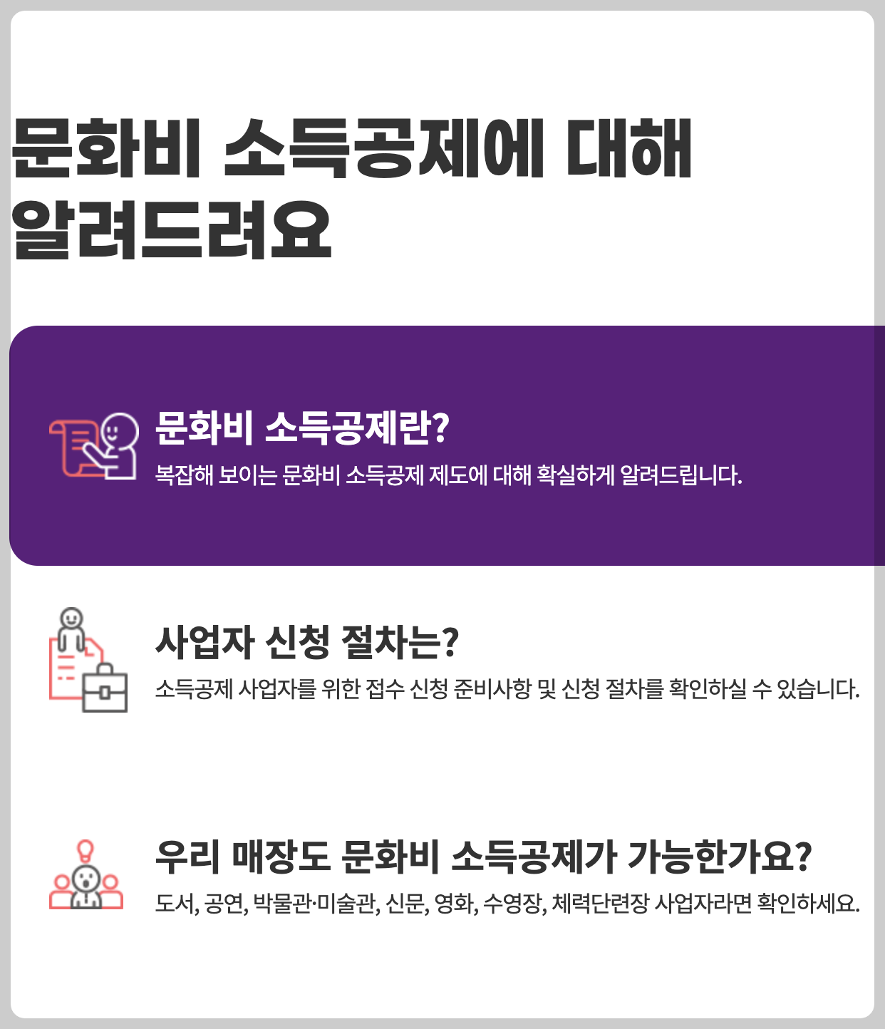 문화비 소득공제 누리집은 말 그대로, 소득공제가 가능한 문화시설 및 사용처를 확인할 수 있는 온라인 플랫폼입니다.