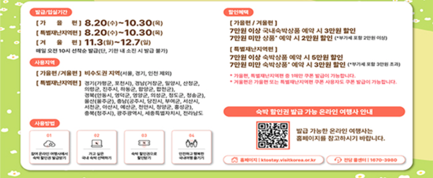 가을편 할인권은 2025년 8월 20일(화) 오전 10시부터 주요 온라인여행사에서 1인1매 선착순으로 발급됩니다.
