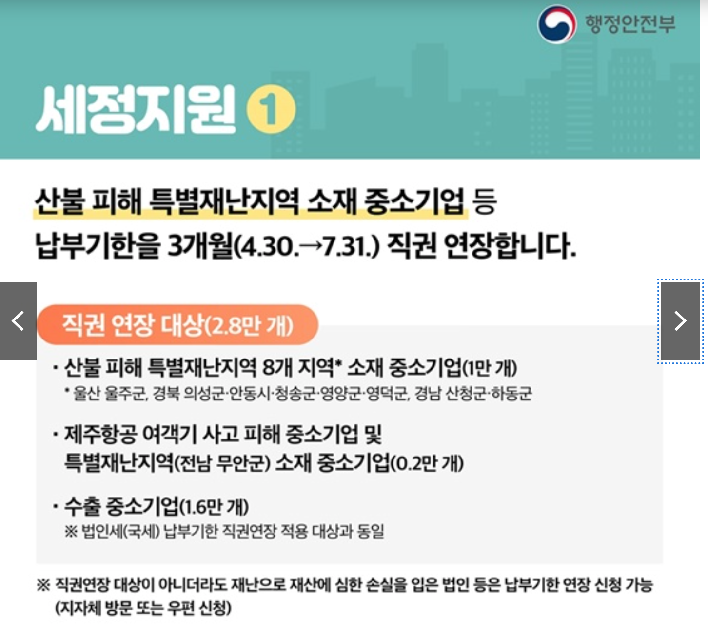산불·지진 등 특별재난지역 소재 중소기업 → 2025년 7월 31일까지 납부 기한 자동 연장