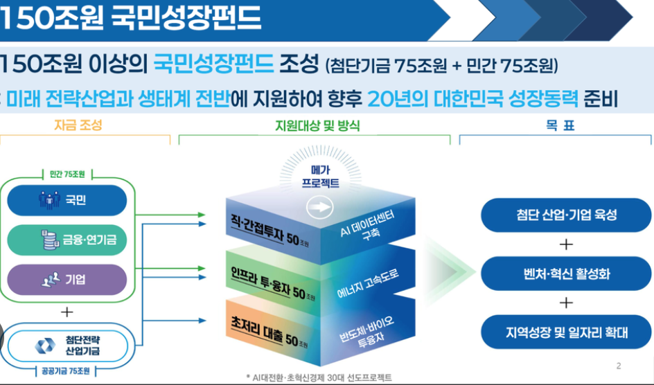 정부가 향후 5년간 인공지능(AI), 반도체 등 첨단전략산업에 대규모 투자를 위해 150조 원 규모의 국민성장펀드를 조성한다고 발표했습니다.