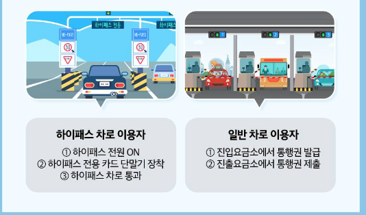 - 일반차로 차량 – 진입 시 통행권을 뽑아야 하며, 출구에서 제출하면 통행료 면제 처리