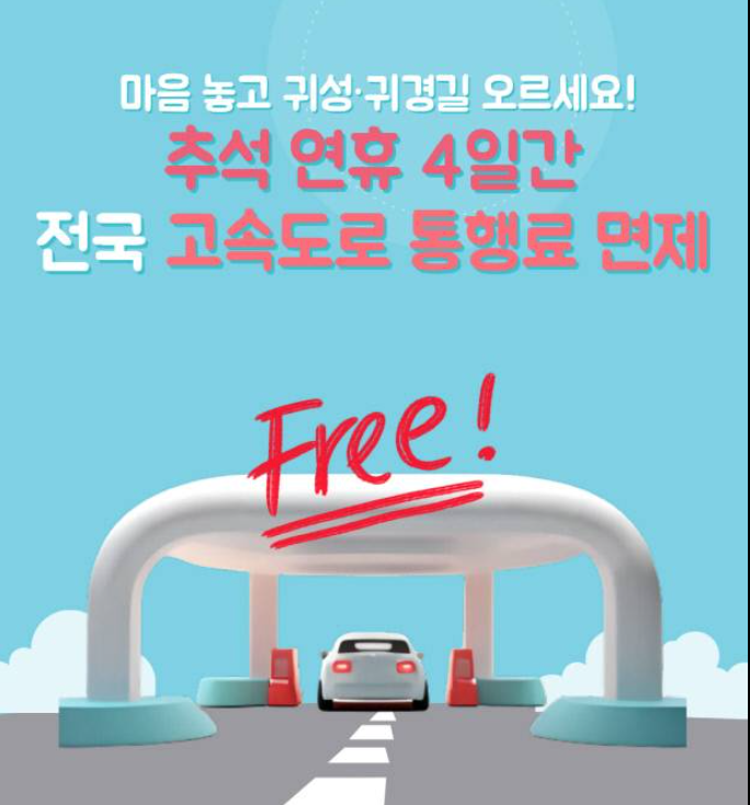 정부가 10월 4일(토)부터 10월 7일(화)까지 총 4일간 전국 고속도로 통행료를 전액 면제하기로 확정했기 때문입니다.