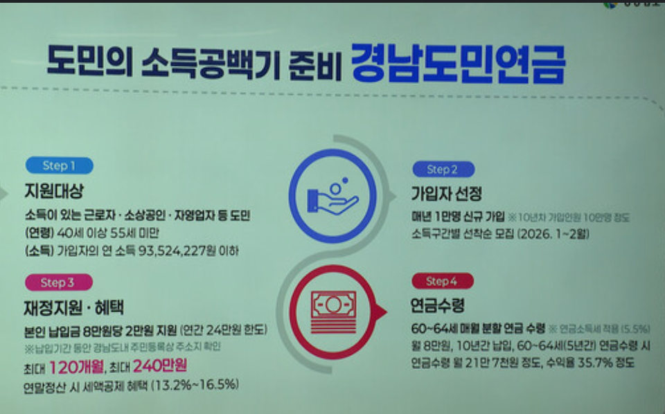 이 제도의 이름이 바로 ‘경남도민연금’으로, 국민연금 사각지대에 놓인 중장년층을 위한 ‘맞춤형 지역 복지모델’이라는 점에서 의미가 큽니다.