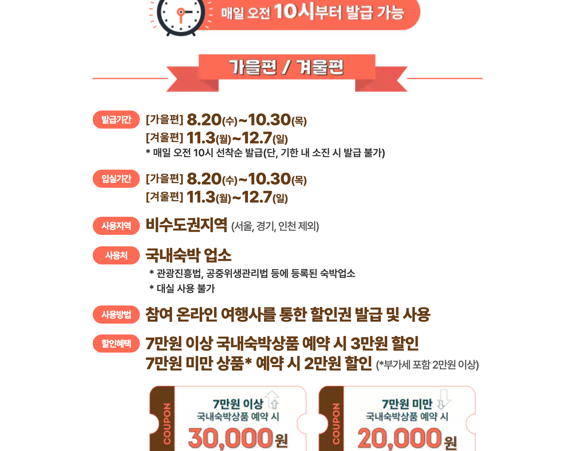 - 숙박요금 7만원 이상 → 3만원 할인.