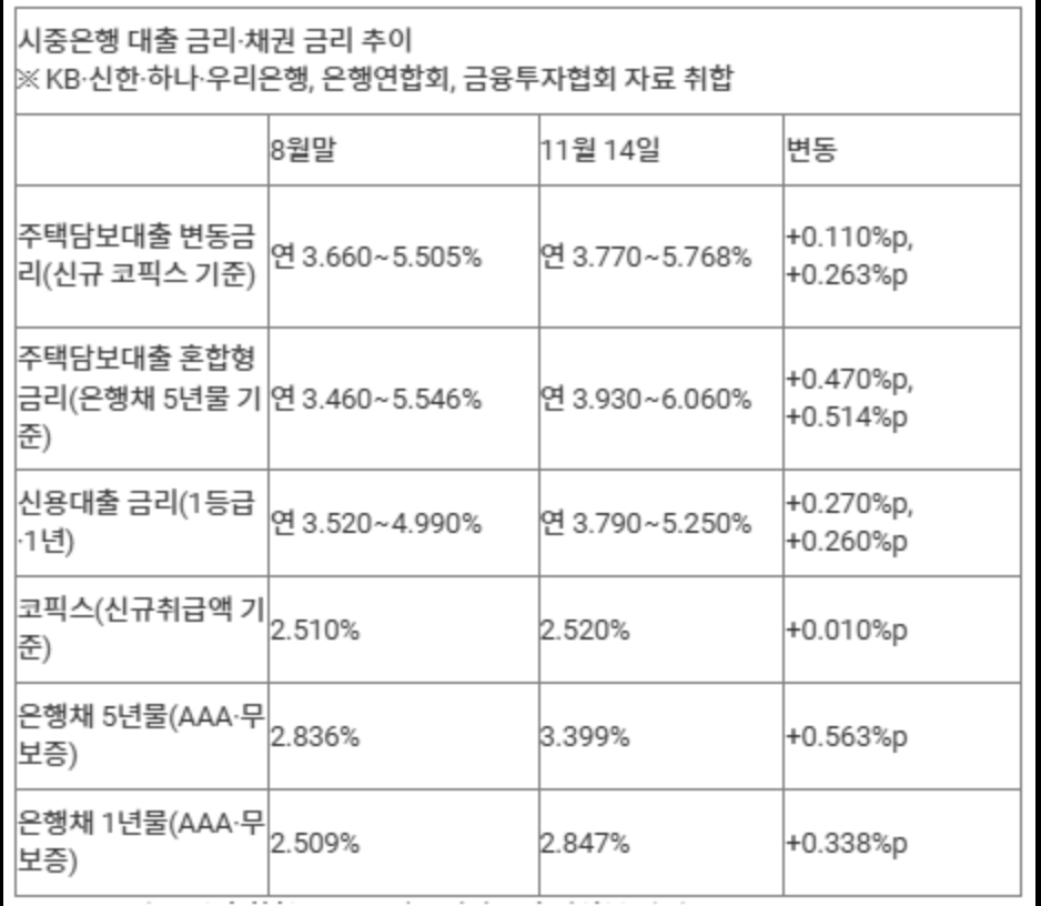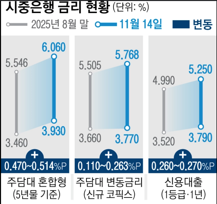 2025년 가을 이후 시장금리(특히 은행채)와 대출 규제 강화를 동시에 반영하며 주담대 금리가 빠르게 올랐습니다