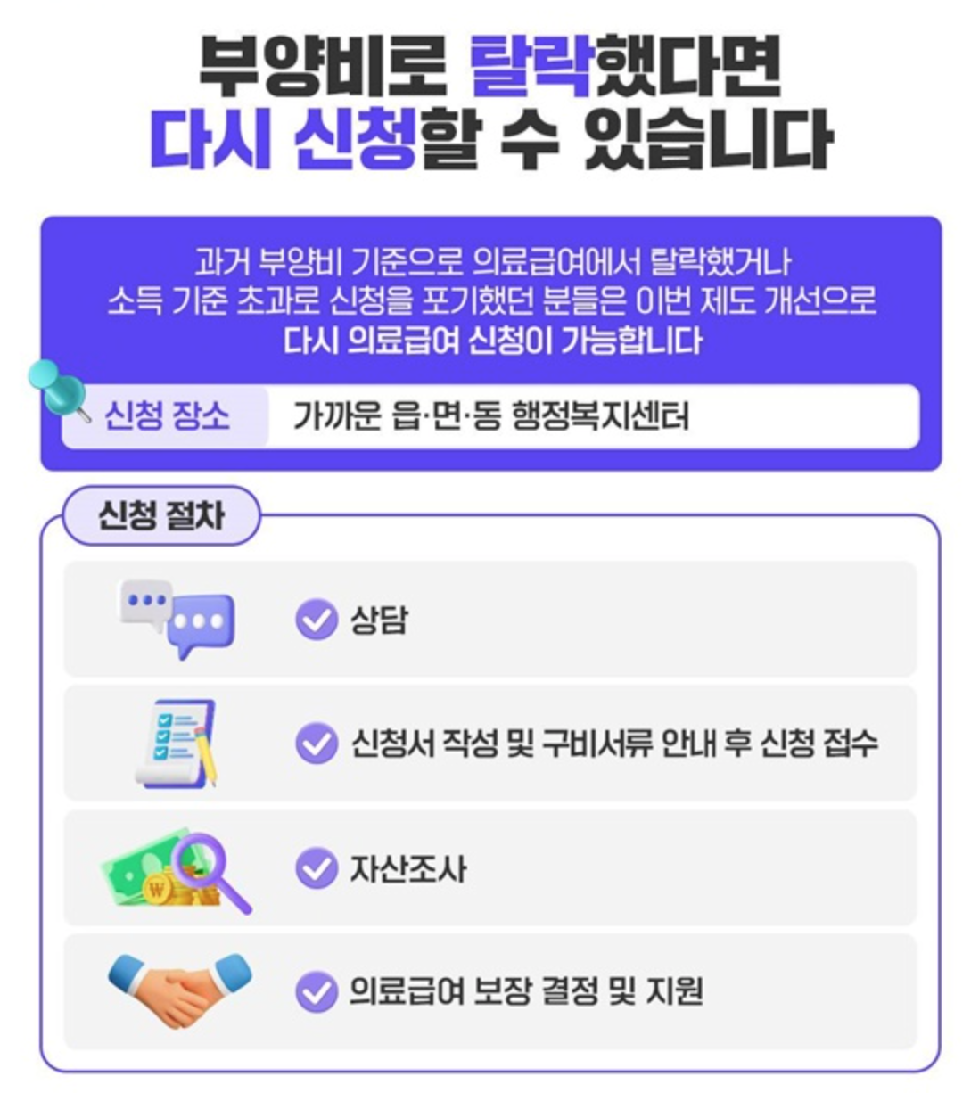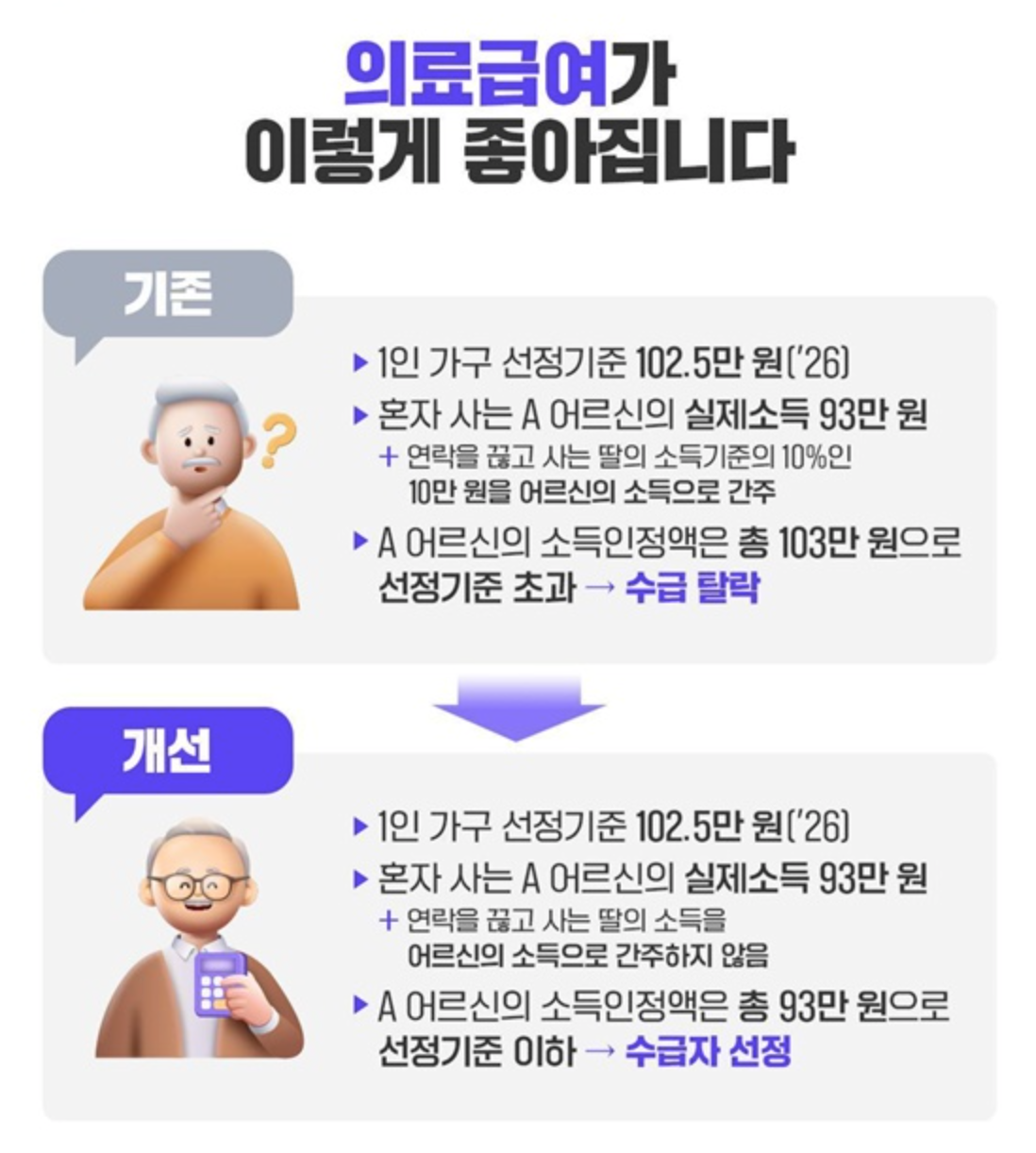 특히 과거 부양비 기준 때문에 의료급여 신청에서 탈락했던 경우라면, 2026년 이후에는 다시 대상이 될 수 있는 여지가 생깁니다.