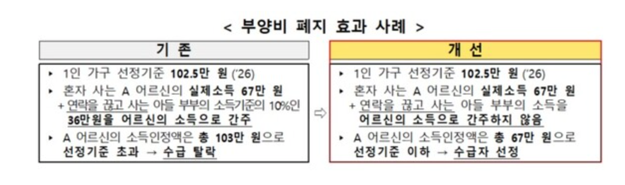 2026년부터는 이러한 부양비 기준이 폐지되면서, 부양의무자의 소득이나 재산과 관계없이 신청자 본인의 경제 상황을 중심으로 의료급여 수급 여부를 판단하게 됩니다.