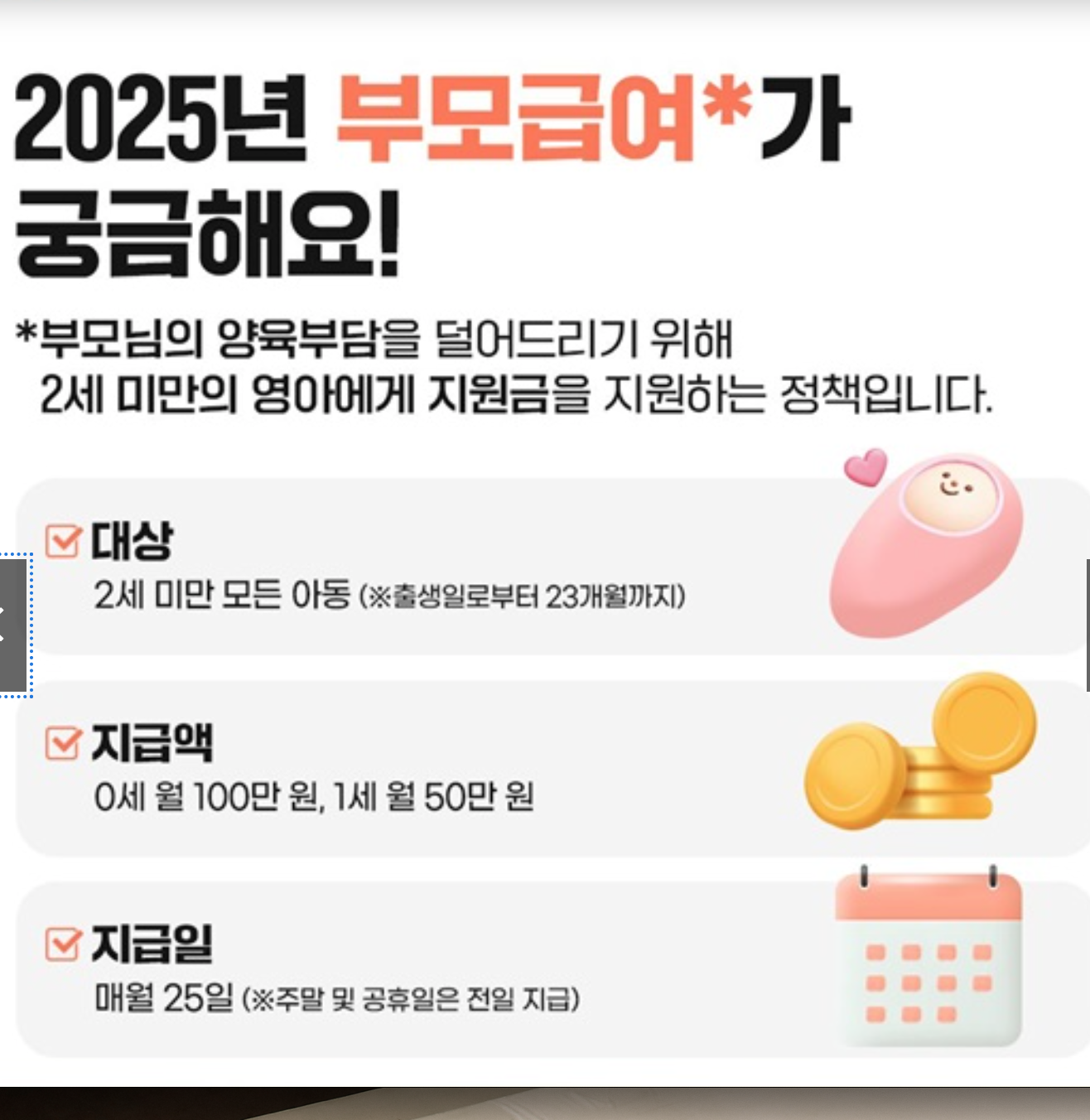 이에 정부는 부모의 양육 부담을 덜어주고, 아이가 건강하게 자랄 수 있도록 돕기 위해 부모급여 제도를 시행하고 있습니다.