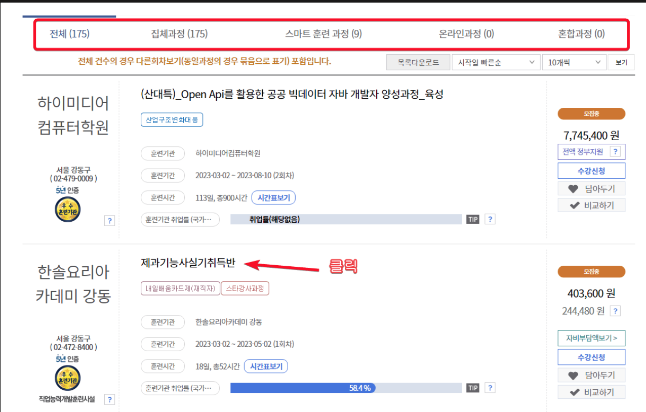 카드 수령 후, 수강하고 싶은 훈련 과정을 검색하여 신청합니다.