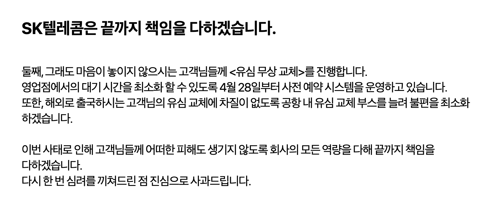 단순한 유심 교체만이 아니라, 다양한 방식으로 고객 보호에 나선 것입니다.
