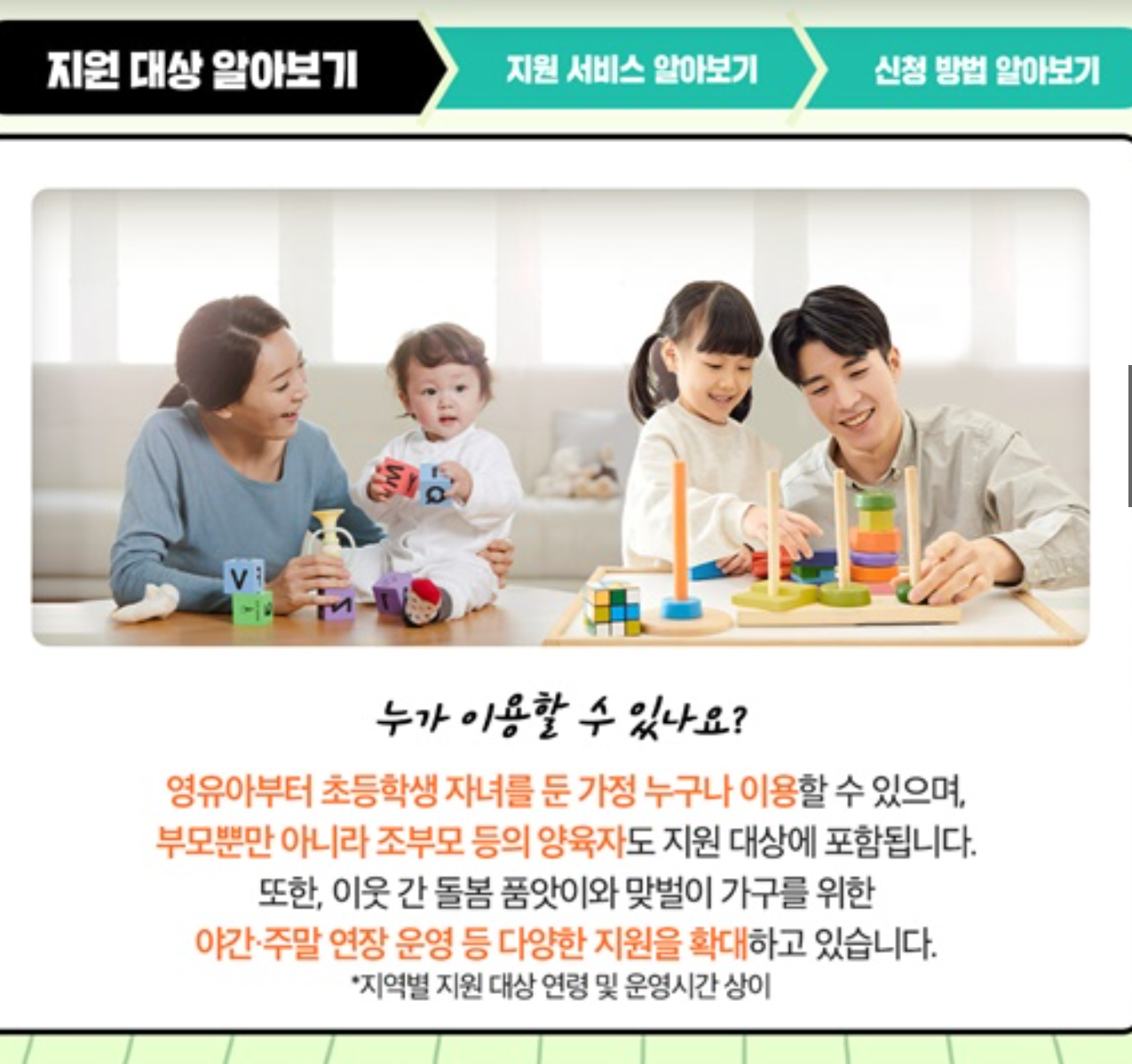 다행히도, 국가와 지자체는 이러한 가정을 지원하기 위해 다양한 돌봄 인프라를 구축하고 있는데요,