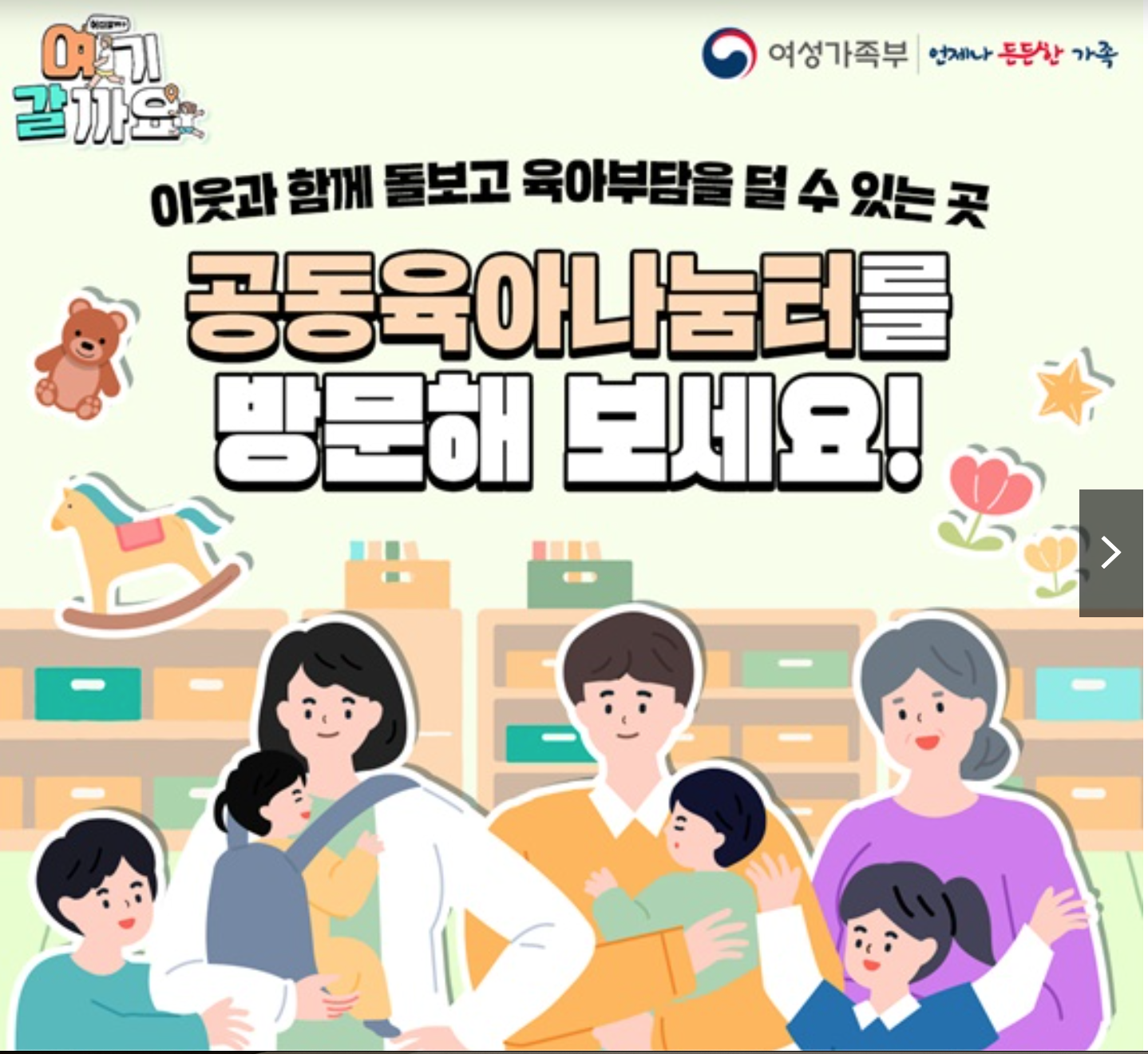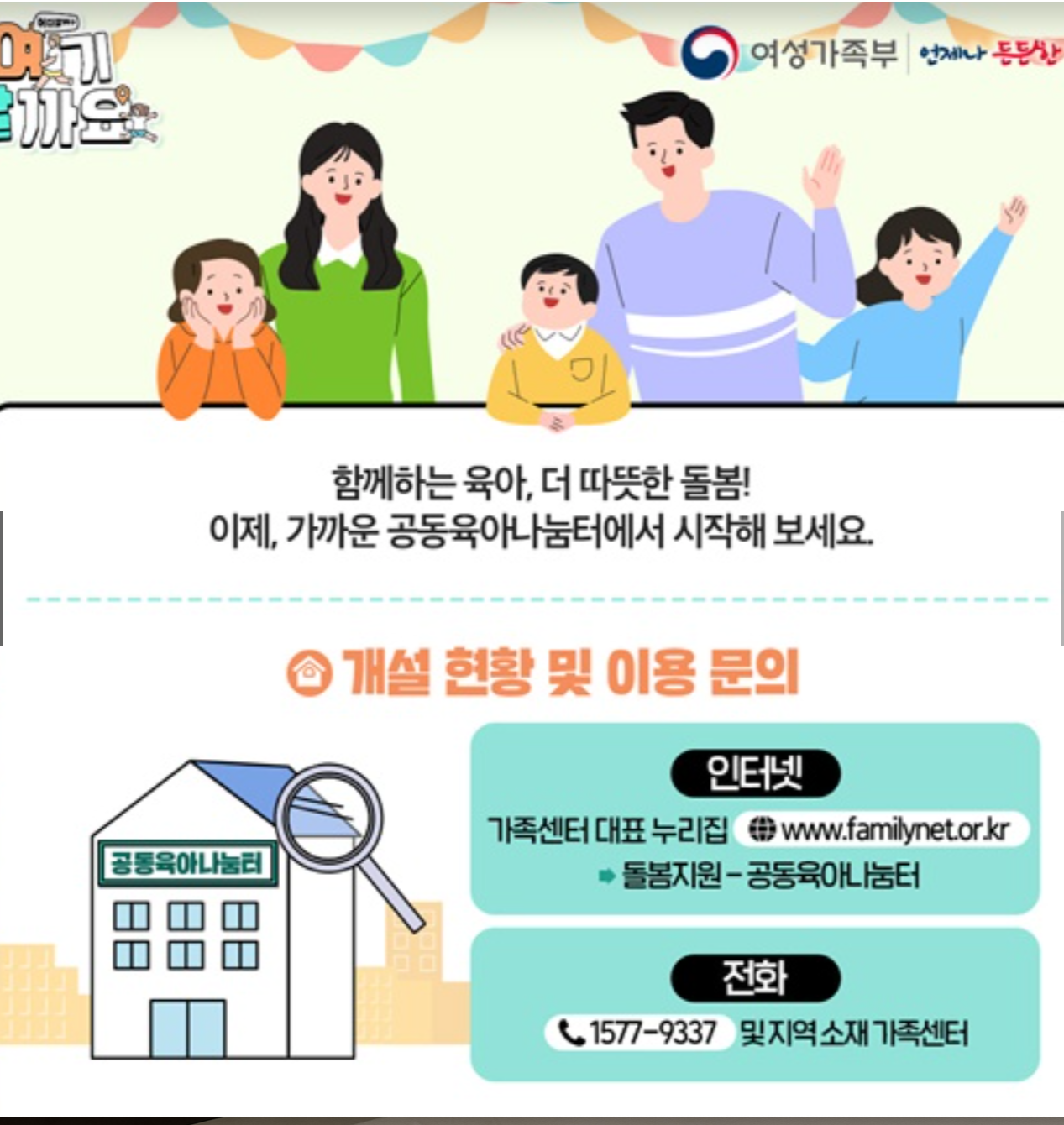 👉 가족센터 포털 → 상단 메뉴 ‘공동육아나눔터 찾기’ https://www.familynet.or.kr