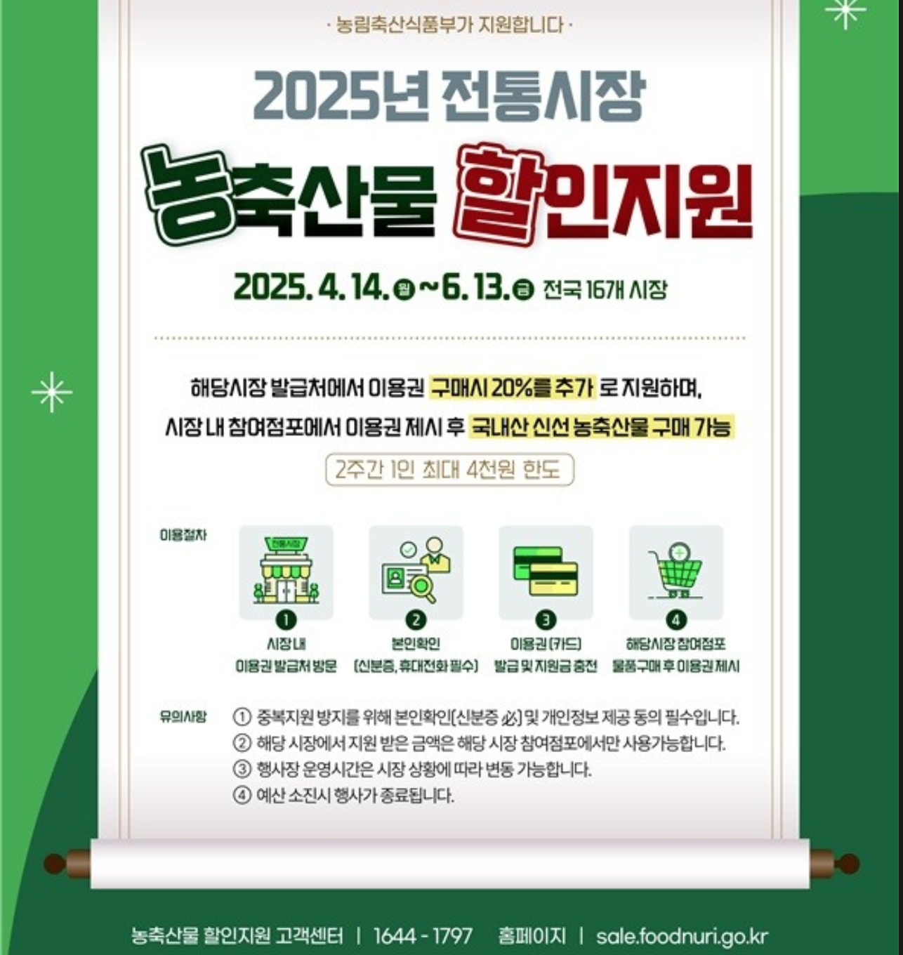 2025년 4월 14일부터 6월 13일까지 약 두 달간, 전국 16개 전통시장에서 ‘농축산물 20% 할인 시범사업’이 진행됩니다.