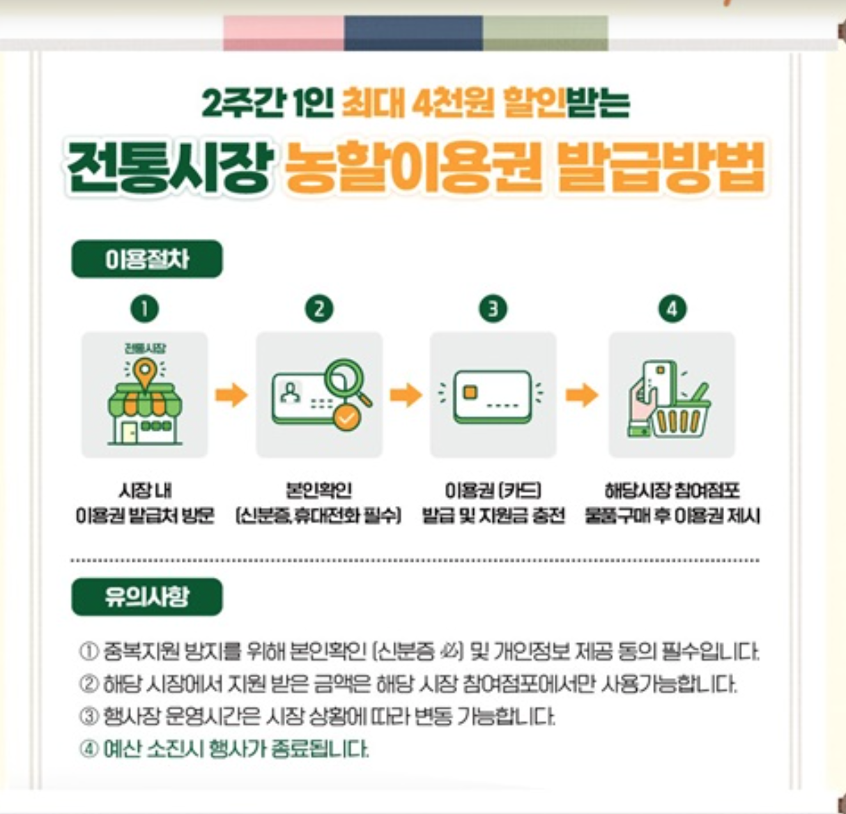전통시장 농축산물 할인 혜택을 받기 위해서는 먼저 해당 전통시장 내에서 발급 가능한 전용 이용권(카드)이 필요합니다.