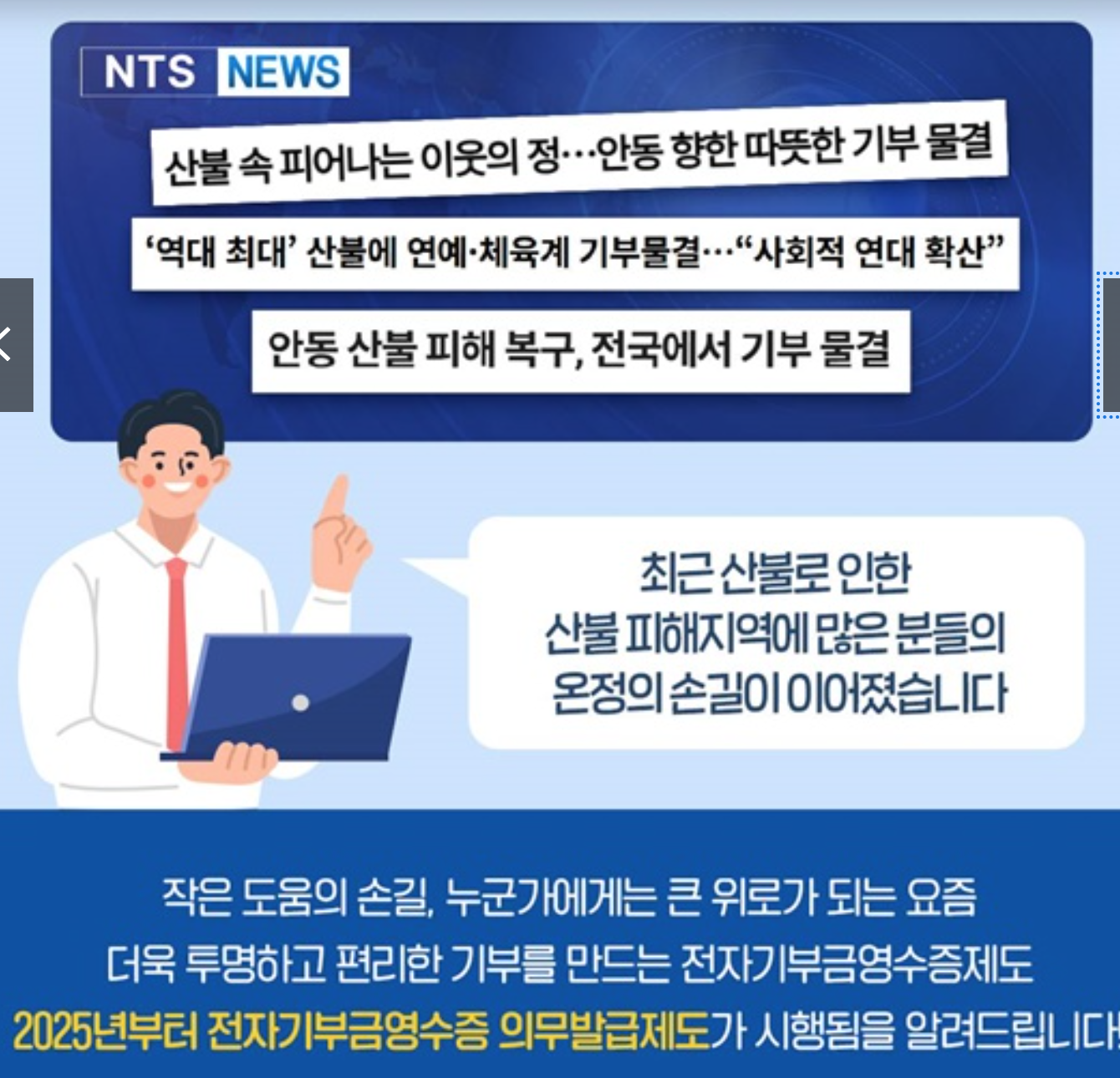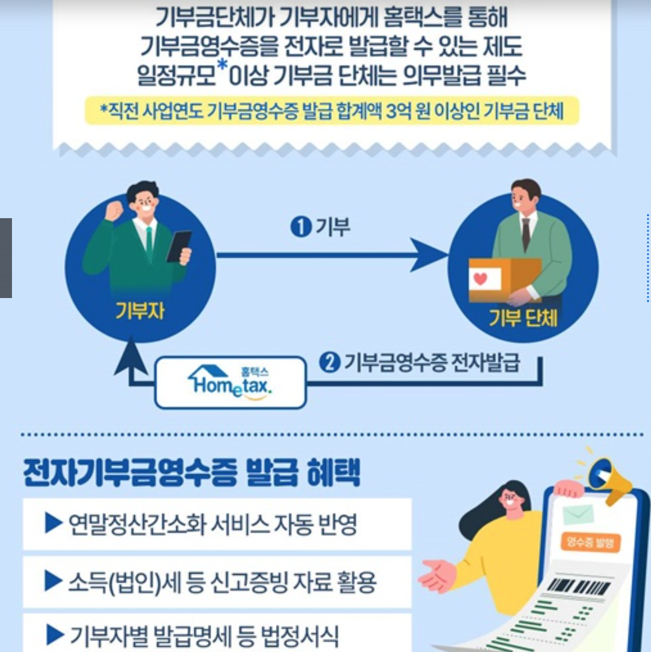하지만 ‘기부금 영수증’ 없이 세금 혜택을 받기는 어렵죠. 특히 2024년부터 전면 시행된 전자기부금영수증 의무발급제도로 인해 이제는 종이 영수증보다 전자 시스템을 통한 발급이 중요해졌습니다.