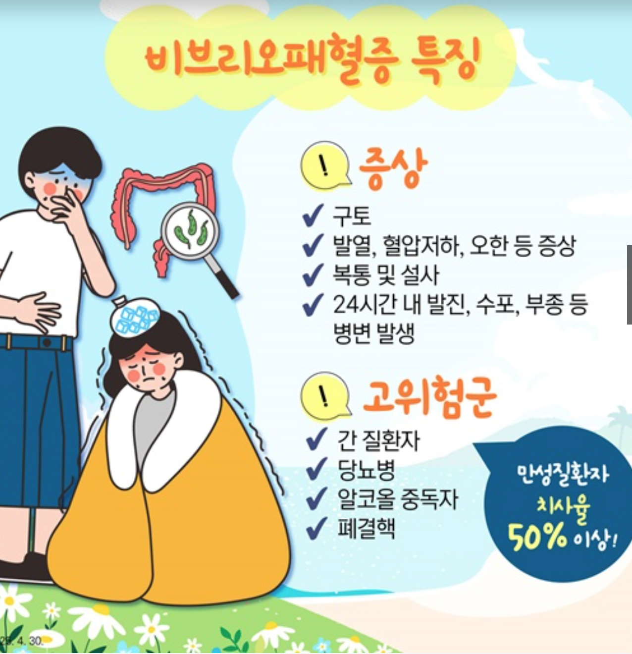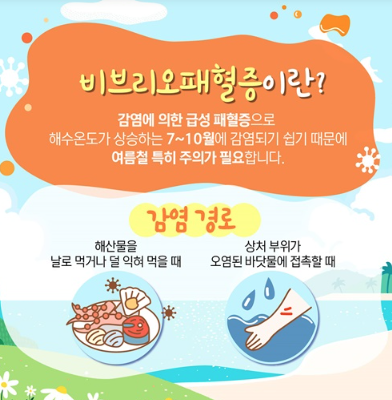 특히 만성질환자나 노약자, 면역 저하자분들은 여름철 어패류 섭취와 해수욕에 각별히 주의가 필요합니다.
