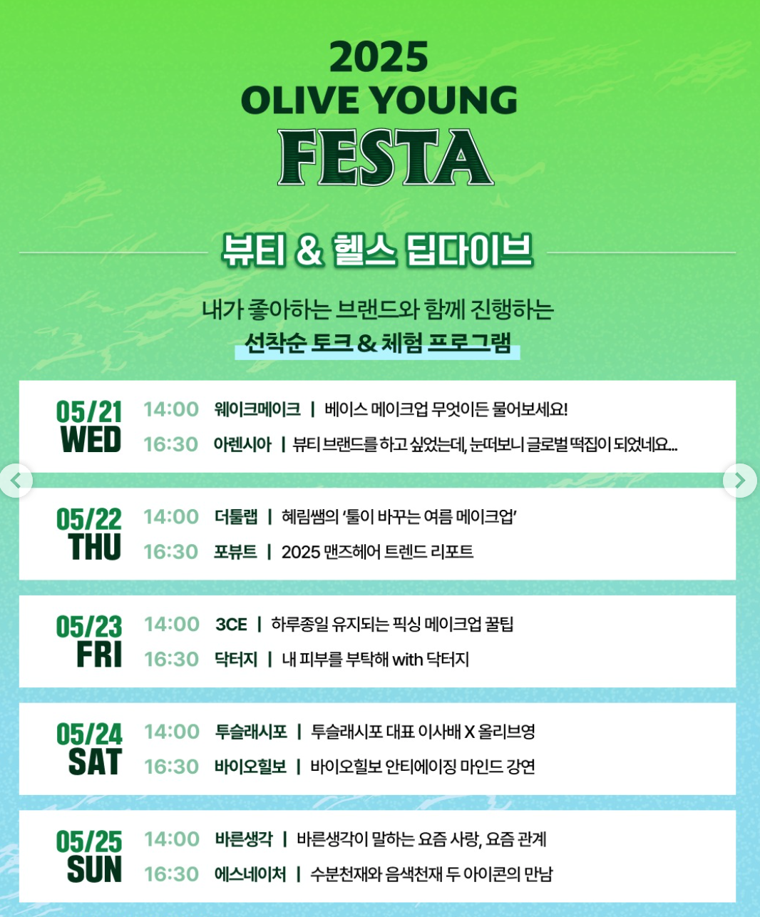 이번 올리브영 페스타는 2025년 5월 21일(수)부터 25일(일)까지 단 5일간만 열립니다.