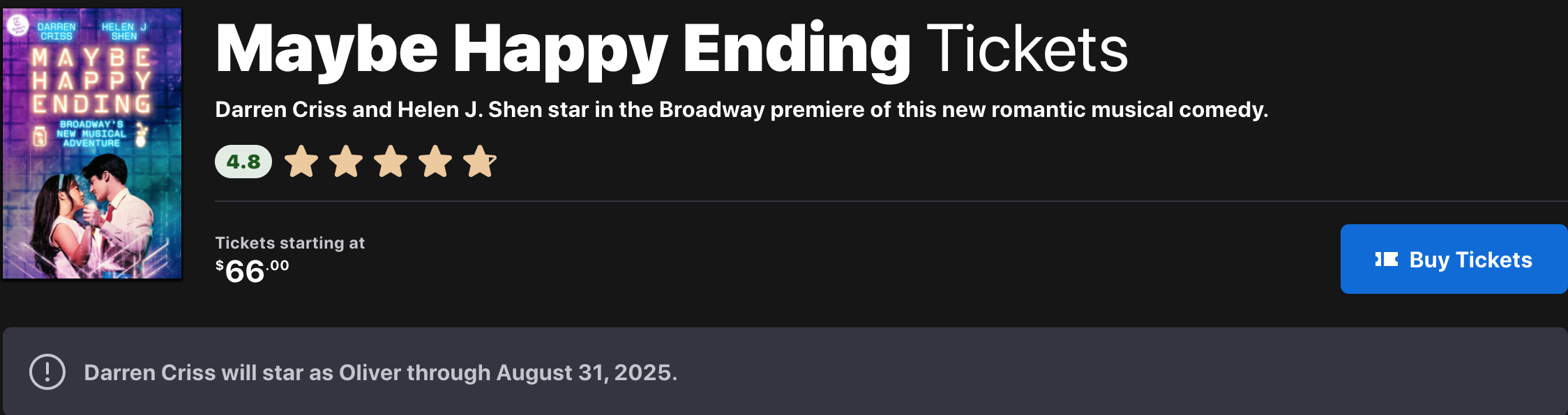 브로드웨이 공식 홈페이지 공연 정보 https://www.broadway.com/shows/maybe-happy-ending/
