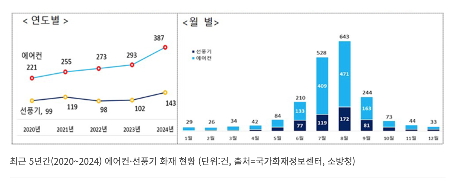 놀랍게도 최근 5년간 에어컨 화재는 1.8배, 선풍기 화재는 1.4배 늘었다는 통계가 있습니다.