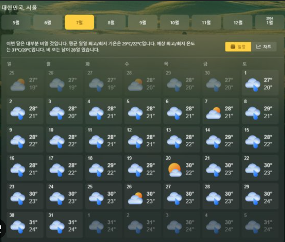 | 여행 일정 | 6월 중순 이전 또는 7월 말 이후 추천 |