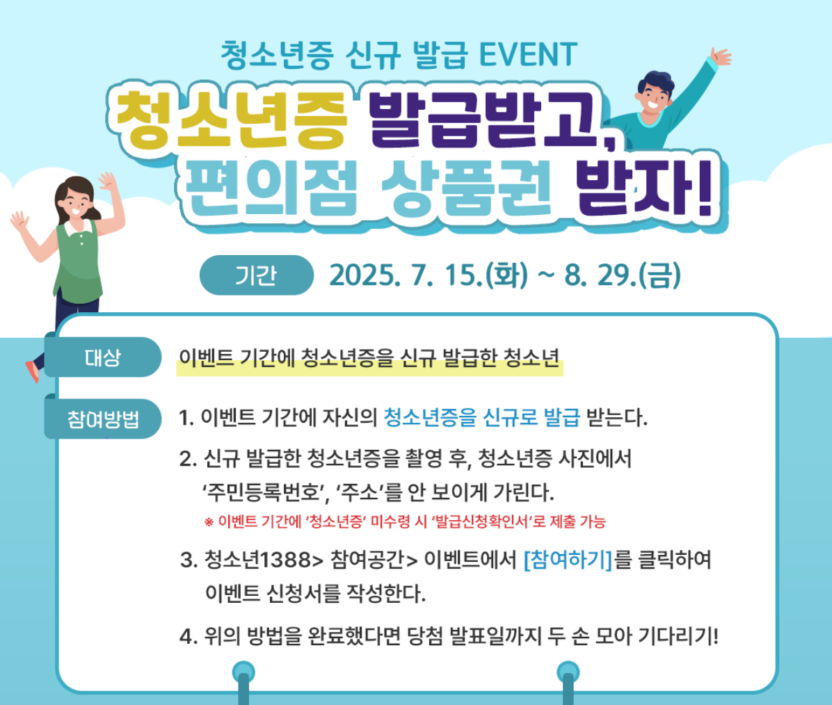 2025년 7월 15일부터 8월 29일까지, 청소년증을 새로 발급받은 친구들이 ‘청소년포털 1388’ 사이트에 인증 사진만 올리면