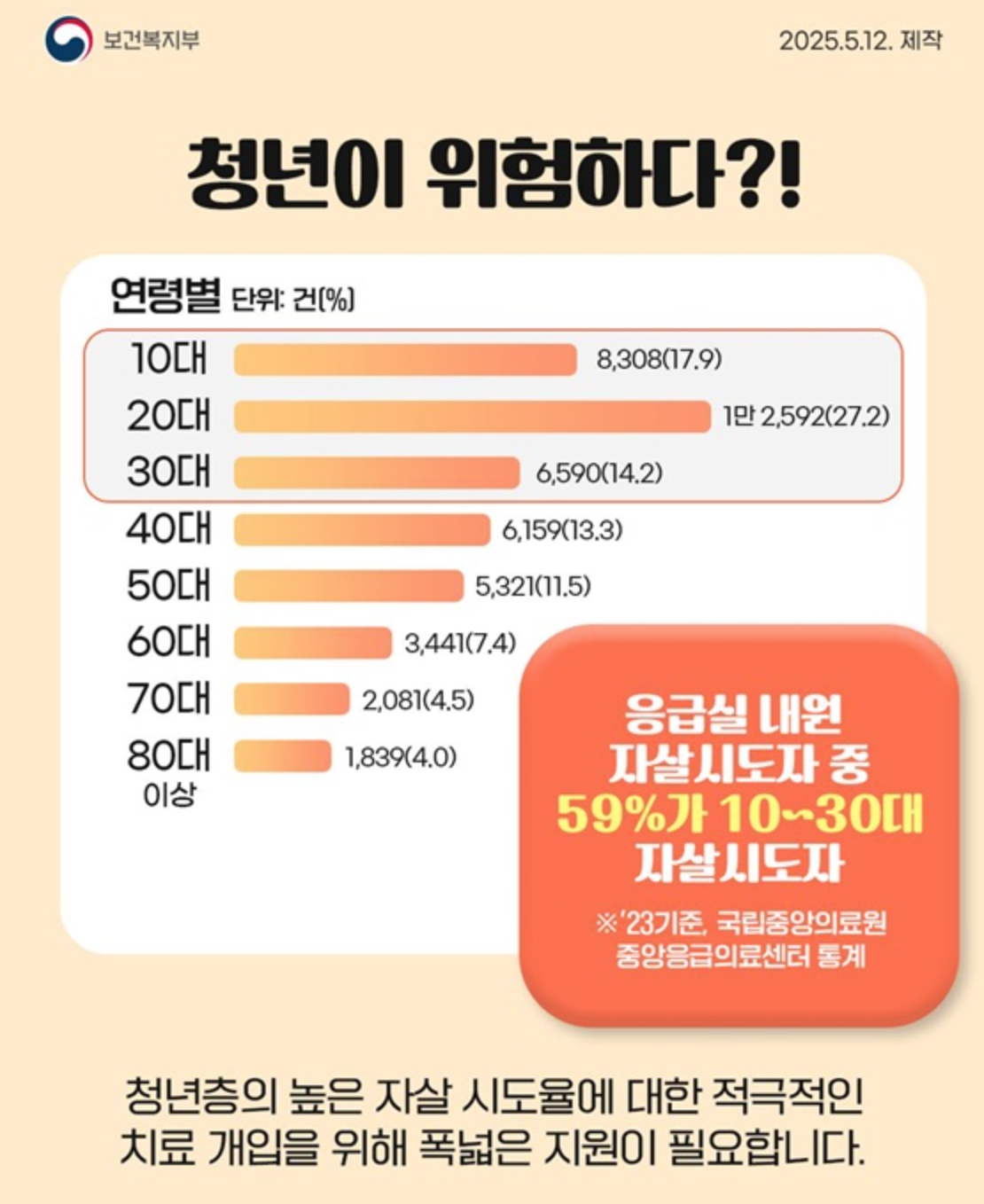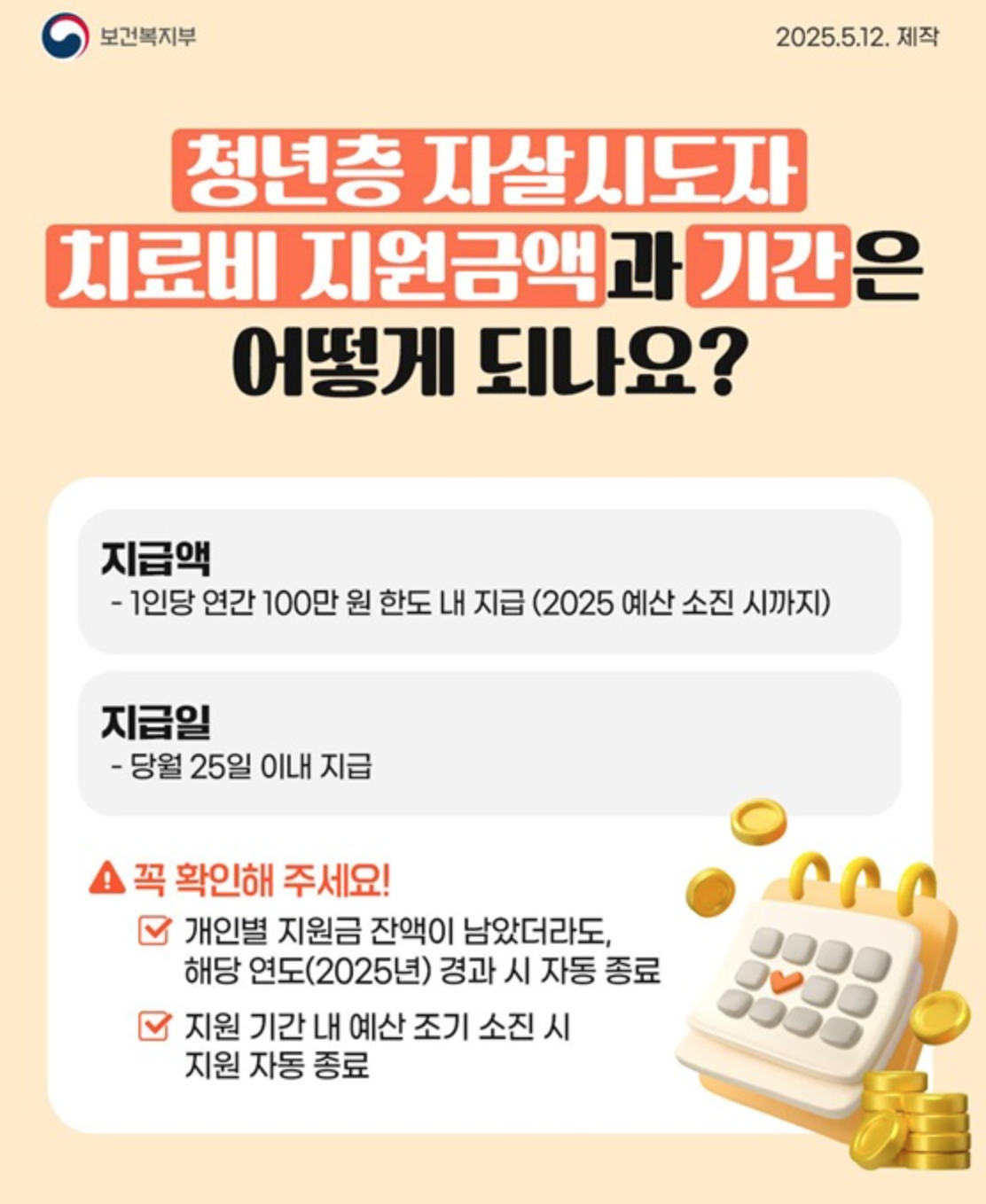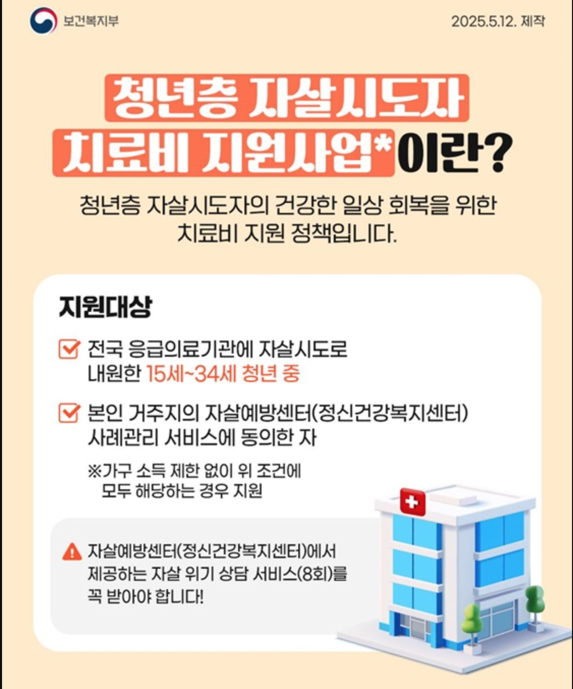 하지만 2025년부터는 전국 모든 응급실에서 15~34세 자살시도자에 대해 최대 100만 원까지 치료비가 지원됩니다.