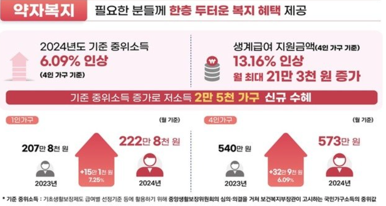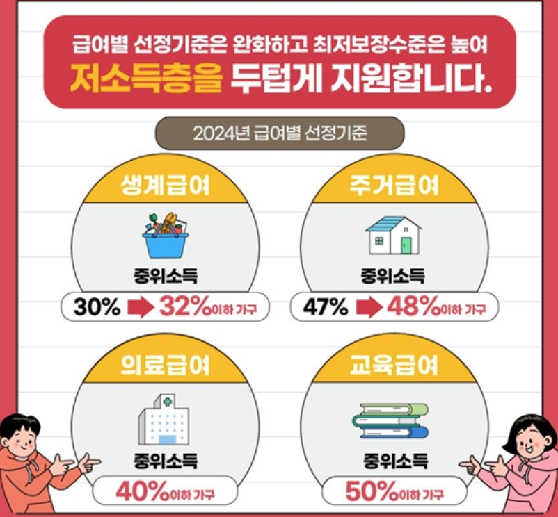 - 생계급여, 의료급여, 주거급여, 교육급여 모두 지원 기준 상향