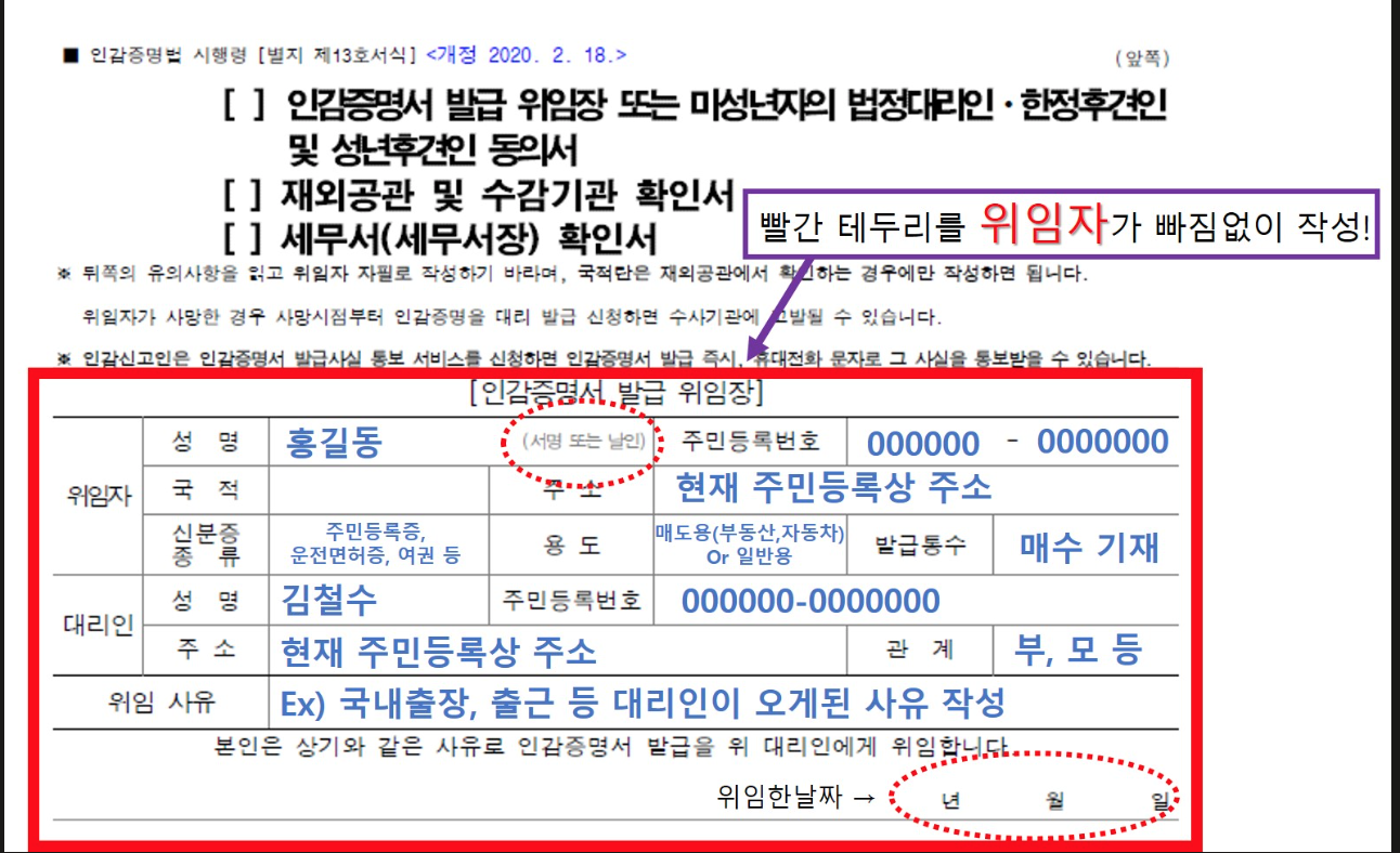 위임장은 인감증명법 시행령에 따라 자필로 작성된 원본이어야 하며, 인감도장을 날인해야 합니다.