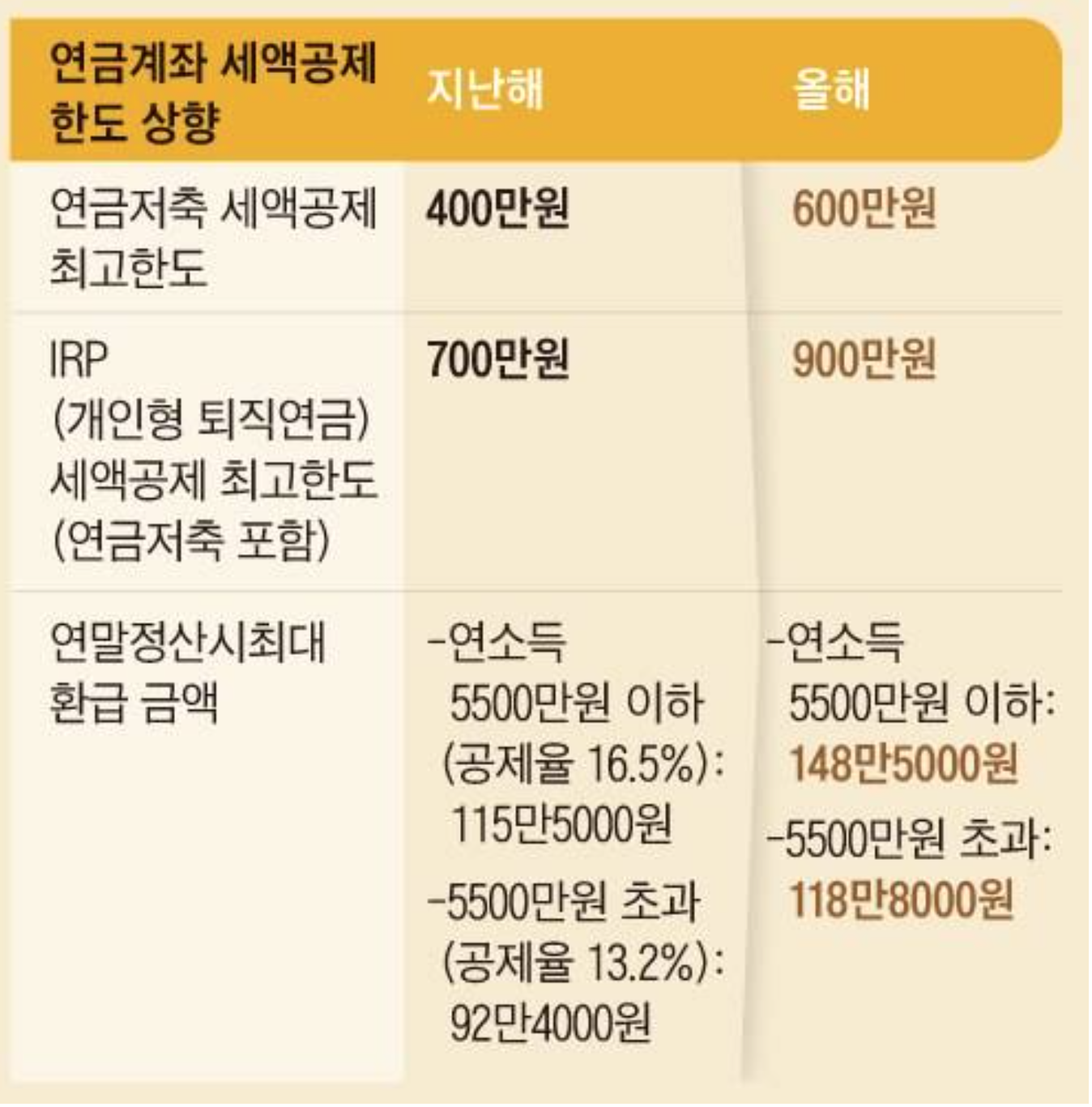 기본 연금저축 400만원 한도 + 퇴직연금(IRP) 200만원을 더해 총 600만원을 납입해야 합니다. - 소득 구간