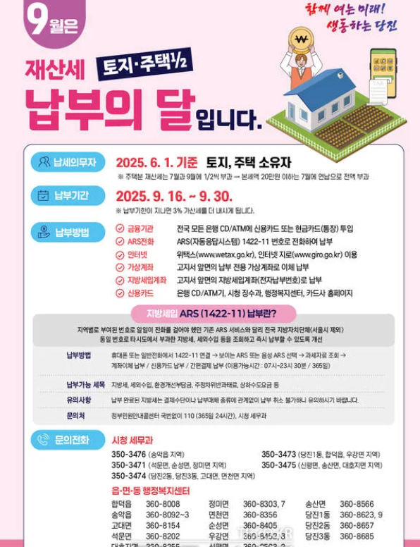 - 납부 방법: 위택스, 가상계좌, ARS, ATM, 주민센터 등
