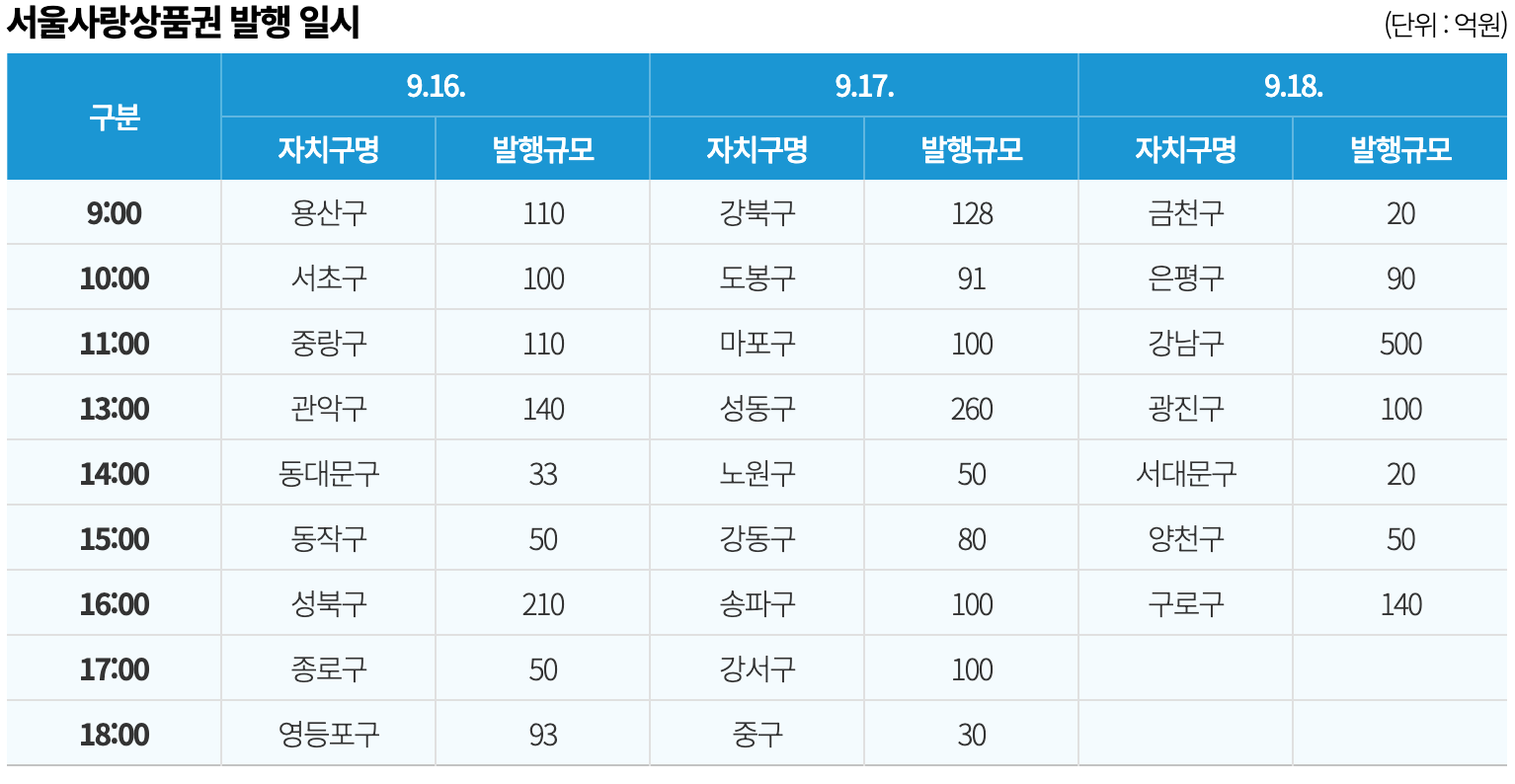 - 서울사랑상품권 발행일정: 9월 16일~18일