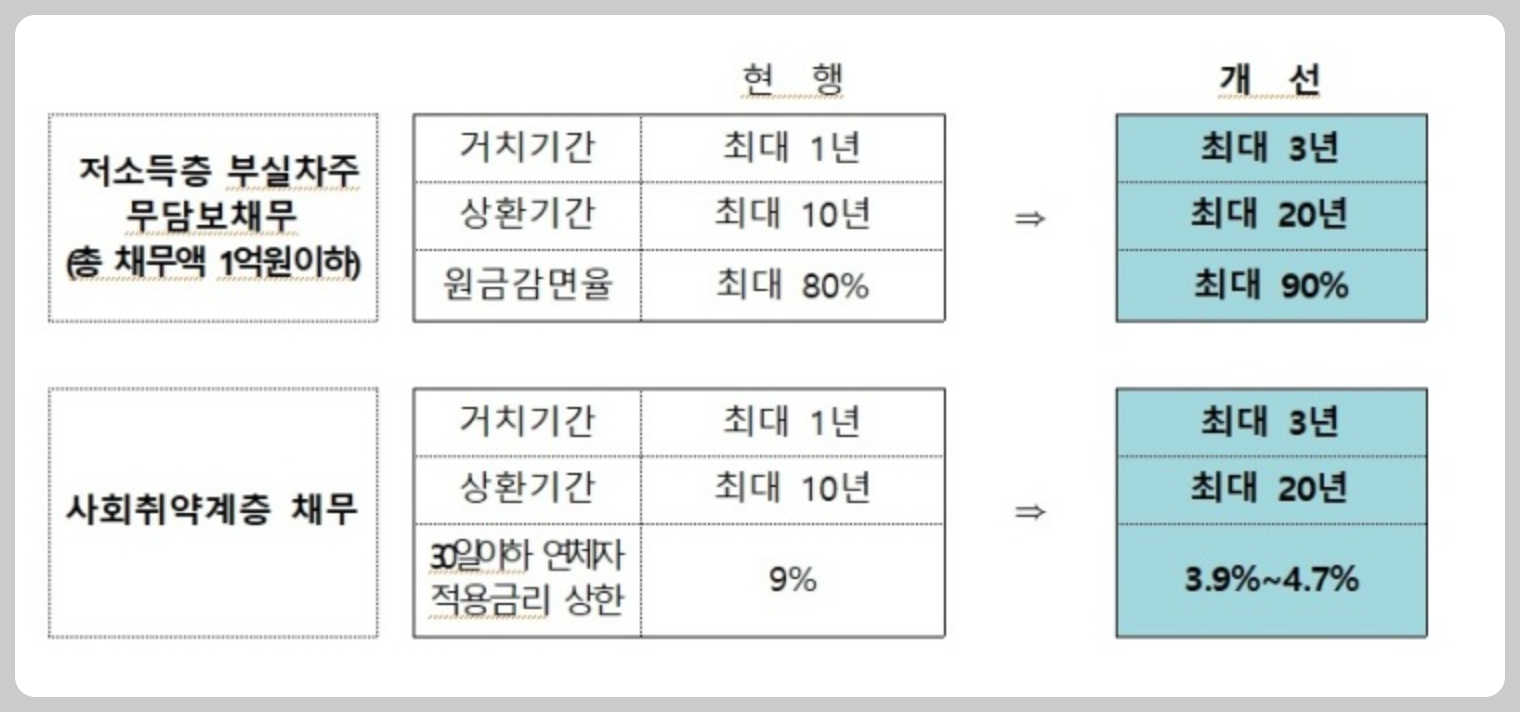 - 상환기간 연장 : 무담보 채무 기준 최대 10~20년