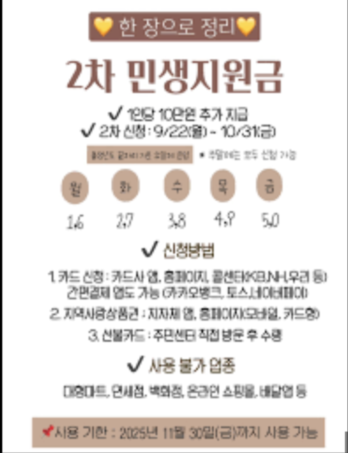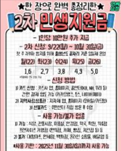민생지원금 2차 지급일은 2025년 9월 말부터 순차적으로 시작될 예정입니다.