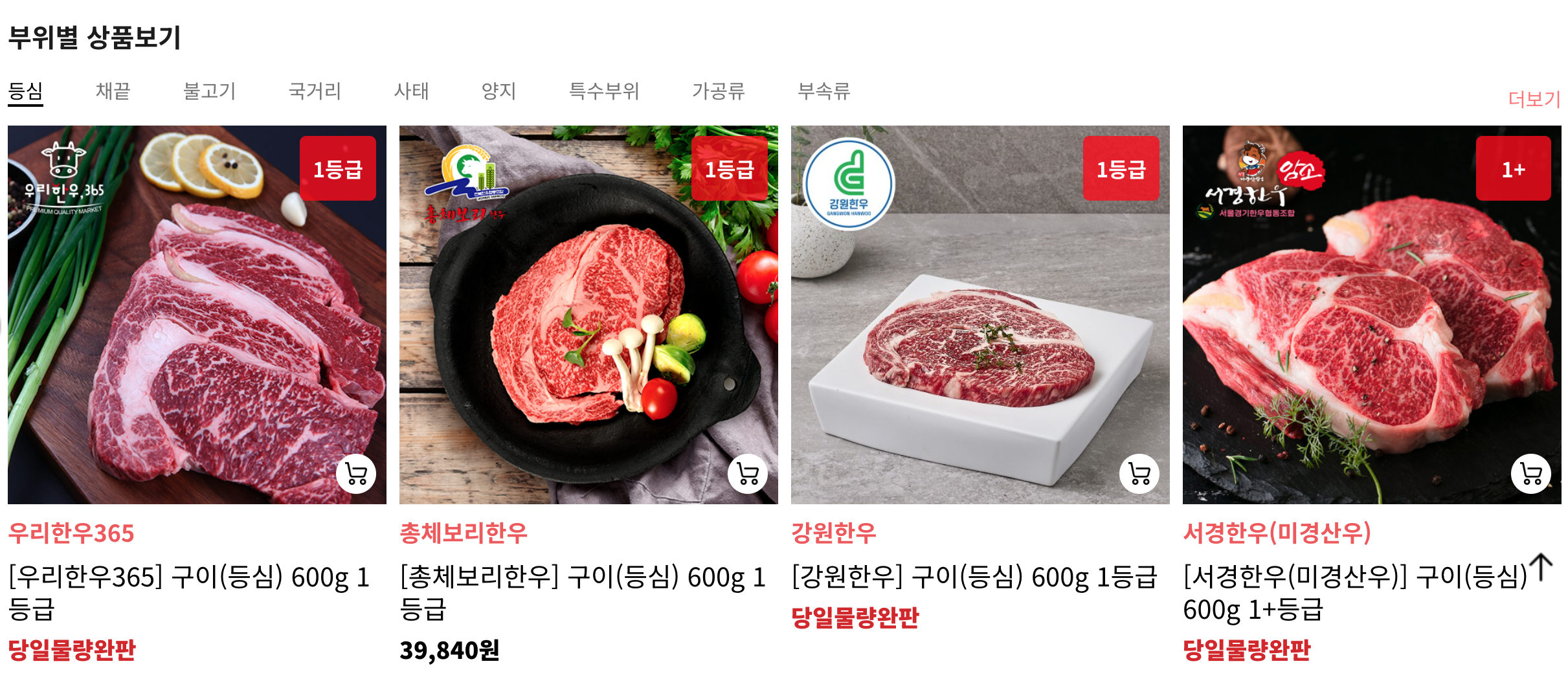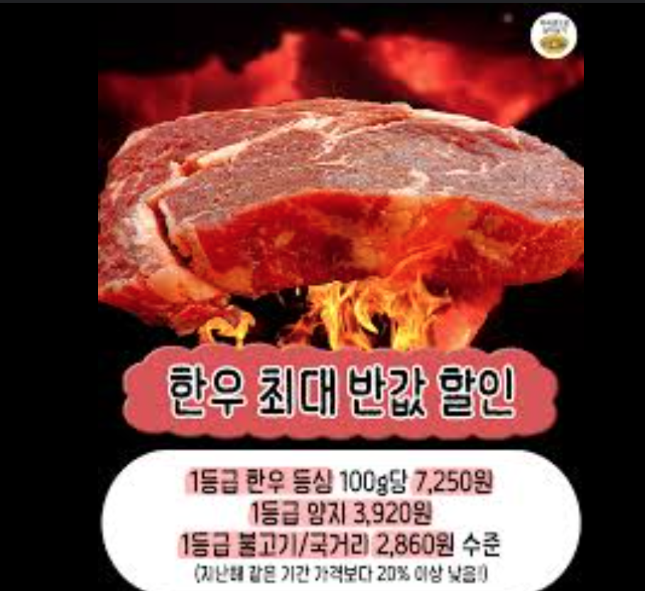 - 최대 50% 할인: 1+등급 등심, 안심, 양지, 불고기 등 다양한 부위