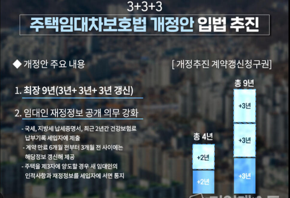 현행 주택임대차보호법이 세입자의 거주 기간을 최대 4년(2+2년) 보장하고 있다면, 앞으로는 최대 9년까지 안정적으로 거주할 수 있도록 바뀔 가능성이 열렸기 때문입니다.