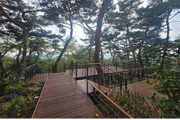 계단 대신 완만한 경사로와 나무데크가 이어져 있어 휠체어나 유모차 이용자도 편안하게 오를 수 있습니다.