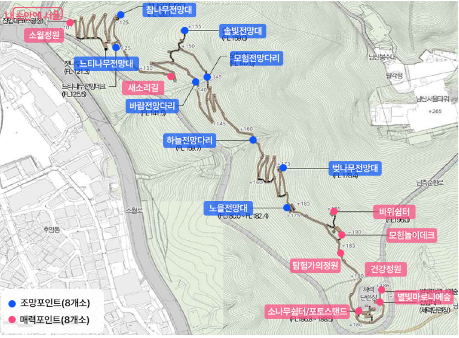 길 중간쯤 위치한 전망데크는 서울타워와 한강 방향이 동시에 보이는 명당입니다.
