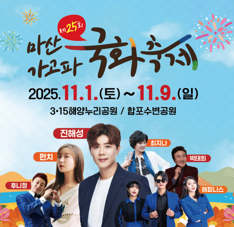 올해 11월 1일부터 9일까지 3·15해양누리공원에서 제25회를 맞이한 이 축제는 국화 전시뿐만 아니라 드론쇼, 인디뮤직페스타, 댄스·치어리딩 공연까지 다채로운 프로그램이 준비되어 있어 가족, 연인, 친구 누구와 함께 가도 즐거운 시간을 보낼 수 있습니다.
