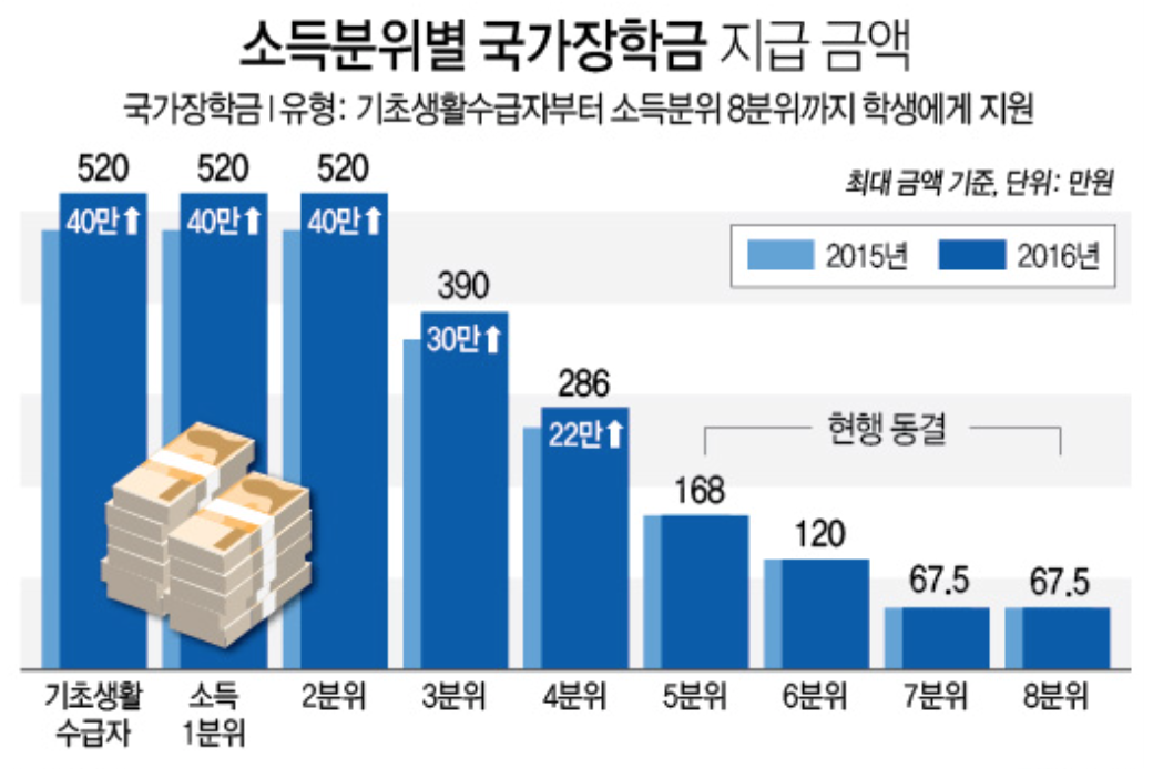 국가장학금 지원 금액은 학생의 소득분위에 따라 달라집니다.