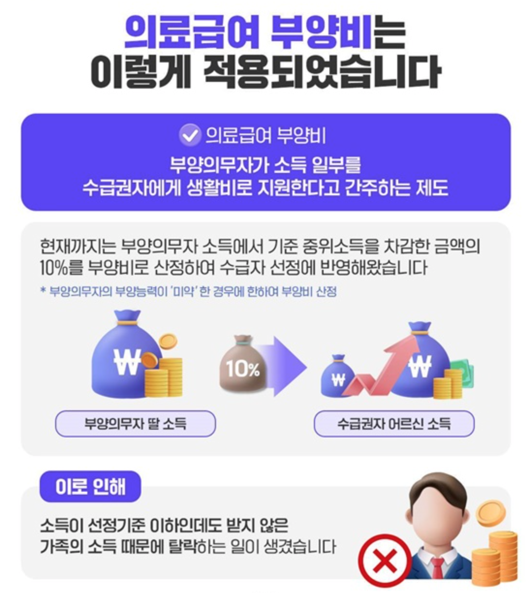 기존 의료급여 제도에서는 신청자의 소득과 재산뿐 아니라, 부양의무자가 부담할 수 있는 부양비 여부까지 함께 심사했습니다.
